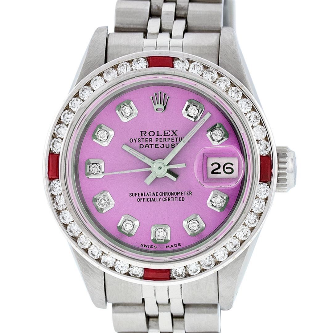 One Ladies Stainless Steel Rolex Datejust Polished Bright with Satin Finish, Serviced & Electronically Tested, Stainless Steel Case: 26mm, Stainless Steel Crown, Custom Bezel: New 18K White Gold Ruby Channel Set Diamond Bezel, Diamond + Gem Count: 36 Diamonds + 4 Rubies Total Weight 1.00 Carat, Clarity: SI-VS, Color: G to H. Custom Crystal: New Synthetic Sapphire Cyclops Lens. Custom Hands: New Luminescent Hands. Movement: Automatic Winding Movement. Custom Dial: Refinished Pink With Diamond Hour Markers. Date Window: 3 O'Clock Position Date Display, Model: Datejust. Condition: G-6 Extra Fine. Bracelet: Stainless Steel Jubilee Band. Bright Polish & Satin Finish. 6.0 Inch Length, Adjustable. Standard Clasp, With Rolex Logo. This Watch Has Been Serviced Time Tested And Is In Excellent Condition It Is Free Of All Scratches And Dents.