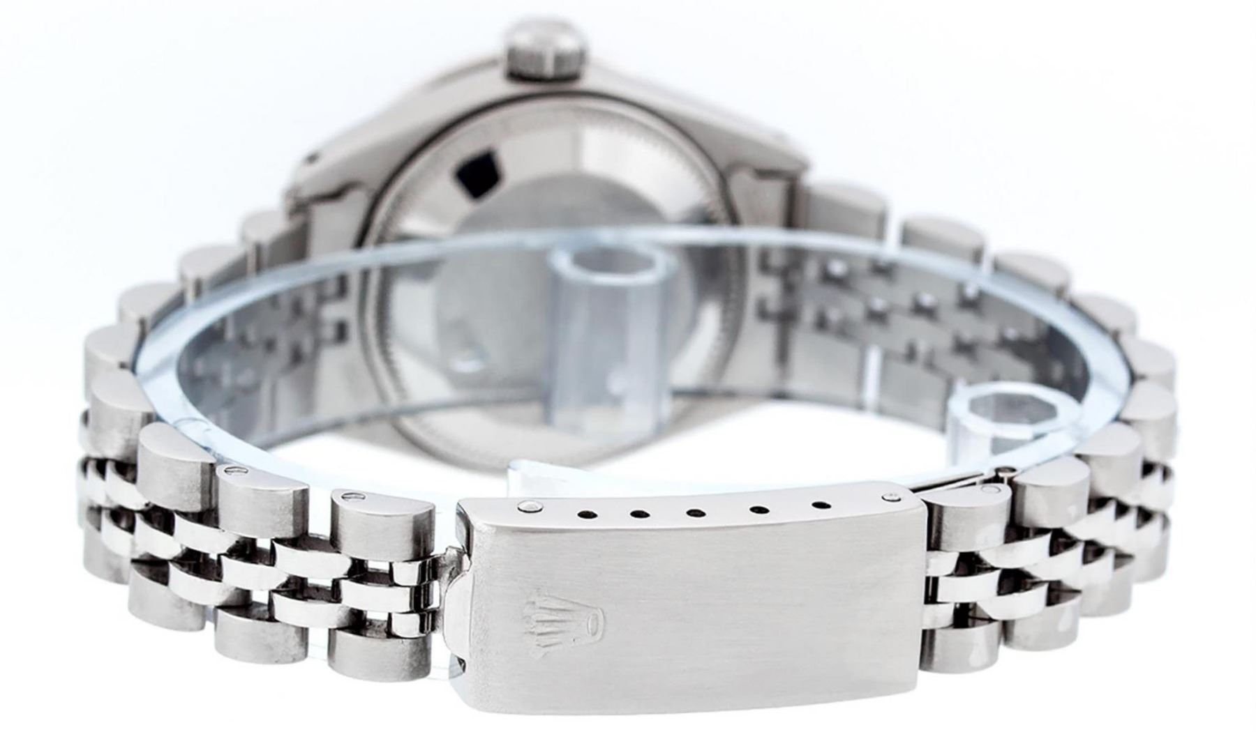 One Ladies Stainless Steel Rolex Datejust Polished Bright with Satin Finish, Serviced & Electronically Tested, Stainless Steel Case: 26mm, Stainless Steel Crown, Custom Bezel: New 18K White Gold Ruby Beadset Diamond Bezel, Diamond + Gem Count: 28 Diamonds + 4 Rubies. Total Weight .70 Carat, Clarity: SI-VS, Color: G to H. Custom Crystal: New Scratch Resistant Synthetic Sapphire Cyclops Lens. Custom Hands: New Luminescent Hands. Movement: Automatic Winding Movement Caliber 2030. Custom Dial: Refinished Pink With Diamond Hour Markers, 10 Diamonds in Dial, G To H In Color, Clarity: SI-VS. Date Window: 3 O'Clock Position Date Display, Model: Datejust. Condition: G-6 Extra Fine. Bracelet: Stainless Steel Jubilee. Bright Polish & Satin Finish. 6.0 Inch Length, Adjustable. Standard Clasp, With Rolex Logo. This Watch Has Been Serviced Time Tested And Is In Excellent Condition It Is Free Of All Scratches And Dents.