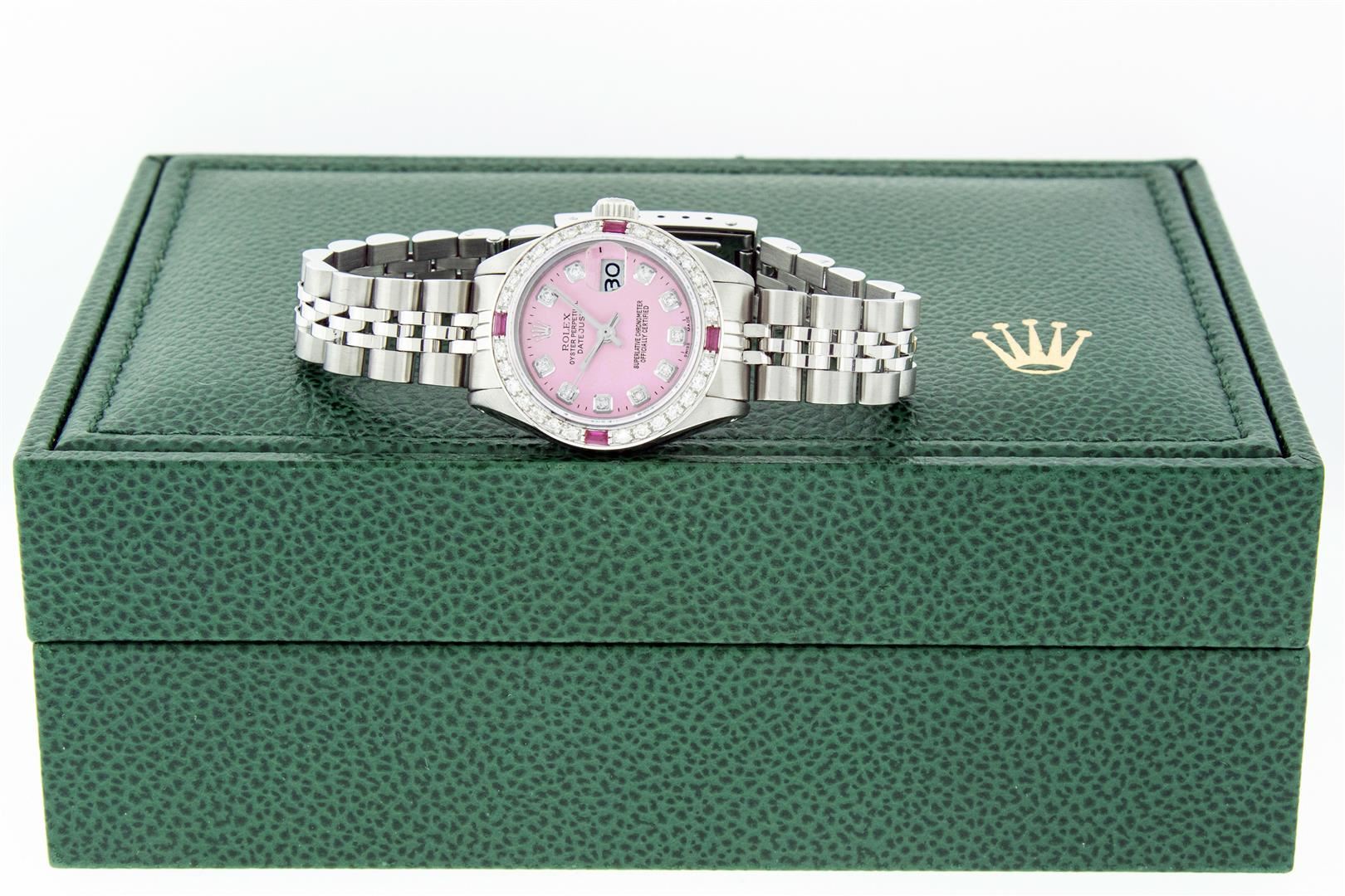 One Ladies Stainless Steel Rolex Datejust Polished Bright with Satin Finish, Serviced & Electronically Tested, Rolex Stainless Steel Case: 26mm, Rolex Stainless Steel Crown, Custom Bezel: New 18K White Gold Ruby Beadset Diamond Bezel, Diamond + Gem Count: 28 Diamonds + 4 Rubies, Clarity: SI-VS, Color: G to H. Custom Crystal: New Sapphire With Magnified Date Window. Custom Hands: New Luminescent Hands. Rolex Movement: Automatic Winding Movement. Custom Dial: Refinished To Pink With Added Diamonds, 10 Diamonds in Dial, G To H In Color, Clarity: SI-VS. Date Window: 3 O'Clock Position Date Display, Model: Datejust. Condition: G-6 Extra Fine. Rolex Bracelet: Stainless Steel Jubilee Band. Bright Polish & Satin Finish. 6.0 Inch Length, Adjustable. Standard Clasp, With Rolex Logo. This Pre Owned Watch Has Been Serviced Time Tested And Is In Excellent Condition It Is Free Of All Scratches And Dents. This Watch Comes With A Rolex Box.