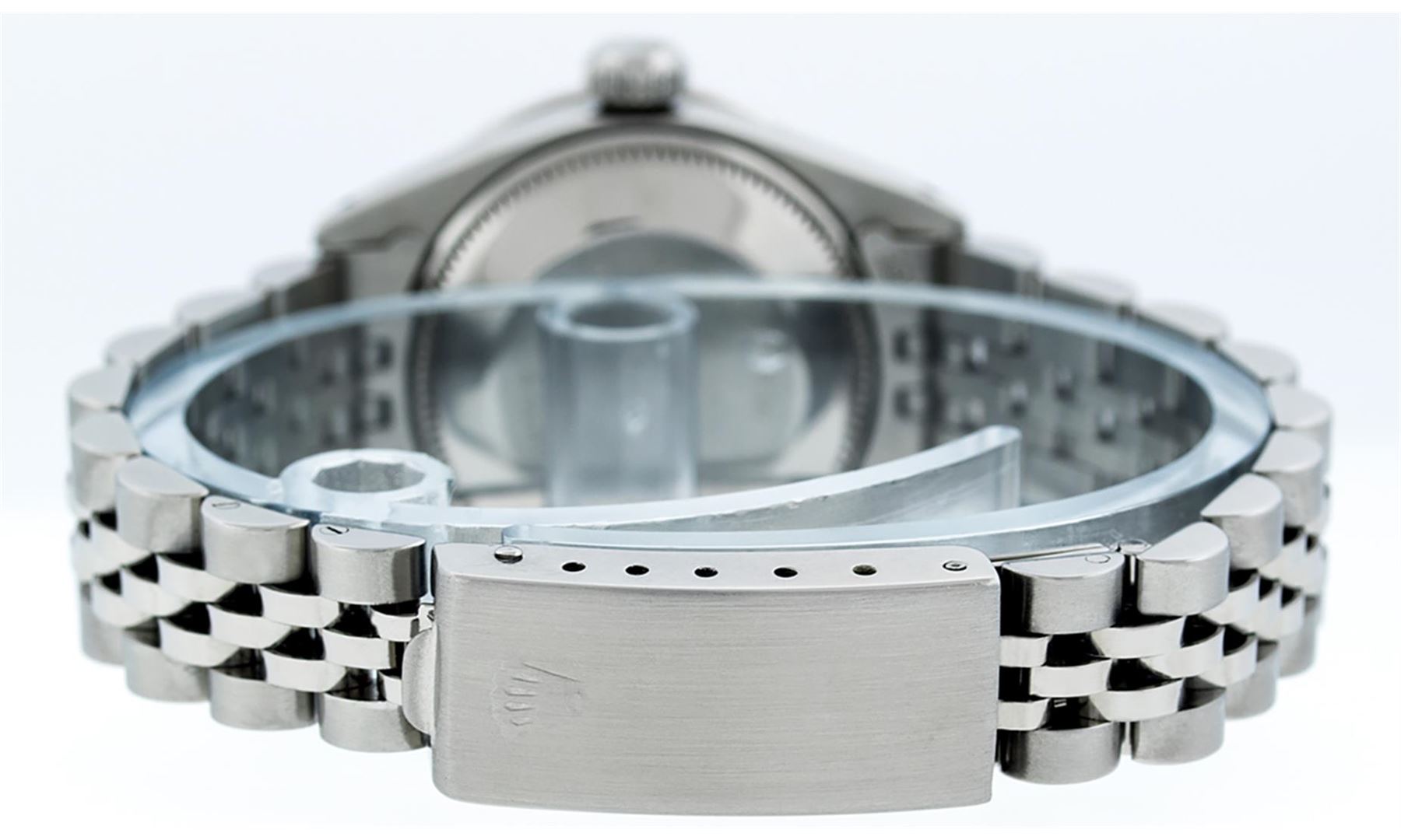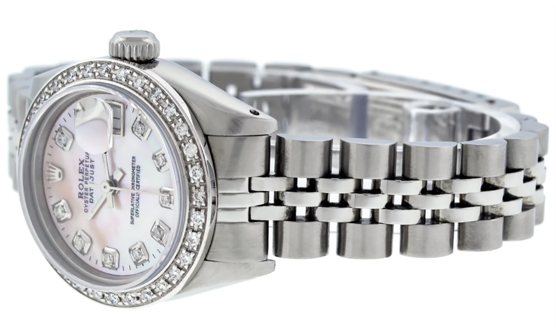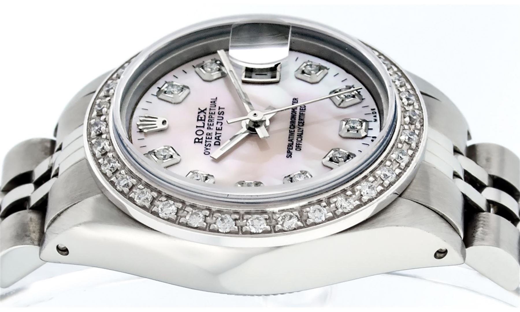 One Ladies Stainless Steel Rolex Datejust Polished Bright with Satin Finish, Serviced & Electronically Tested, Stainless Steel Case: 26mm, Stainless Steel Crown, Custom Bezel: New 18K White Gold Beadset Diamond Bezel, Diamond Count: 32 Diamonds, Total Weight .70 Carat, Clarity: SI-VS, Color: G to H. Custom Crystal: New Synthetic Sapphire Cyclops Lens. Custom Hands: New Luminescent Hands. Movement: Automatic Winding Movement Caliber 2030. Custom Dial: Pink Mother Of Pearl Diamond Dial, Diamond Count: 10 Diamonds In Dial, Color: G To H, Clarity: SI-VS. Date Window: 3 O'Clock Position Date Display, Model: Datejust. Condition: G-6 Extra Fine. Bracelet: Stainless Steel Jubilee. Bright Polish & Satin Finish. 6.0 Inch Length, Adjustable. Standard Clasp, With Rolex Logo. This Watch Has Been Serviced Time Tested And Is In Excellent Condition It Is Free Of All Scratches And Dents.