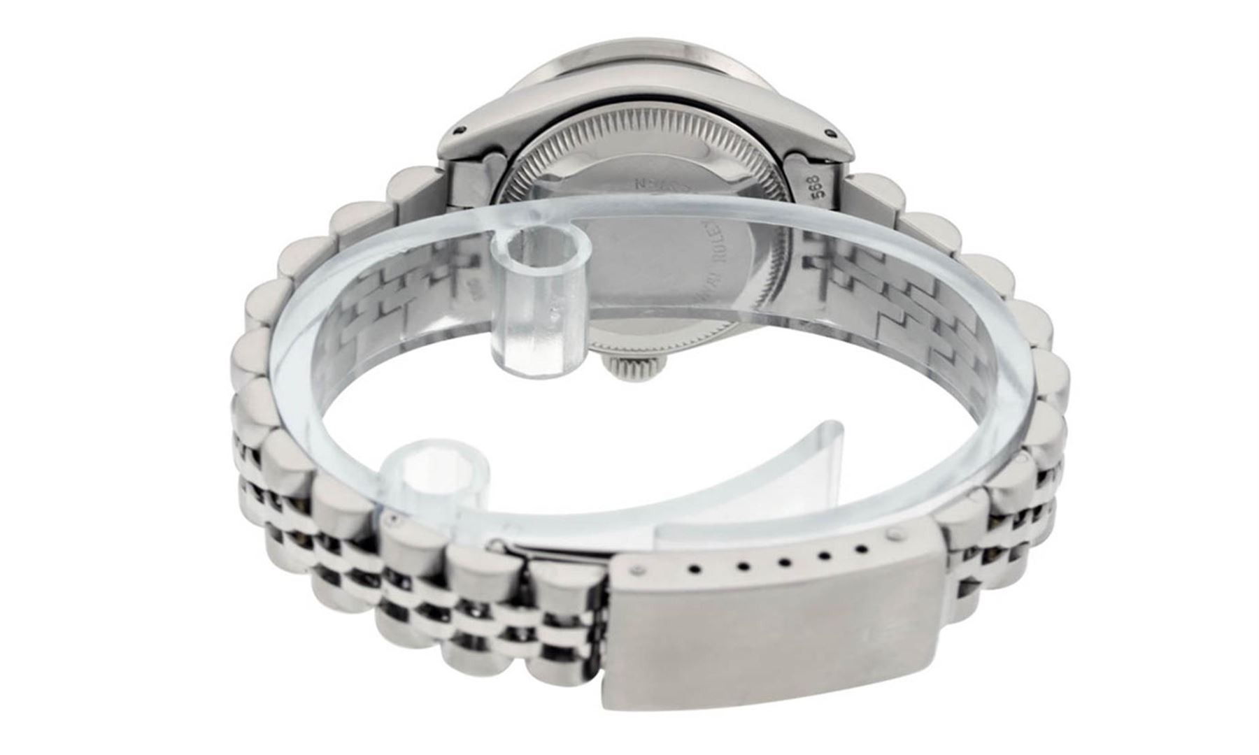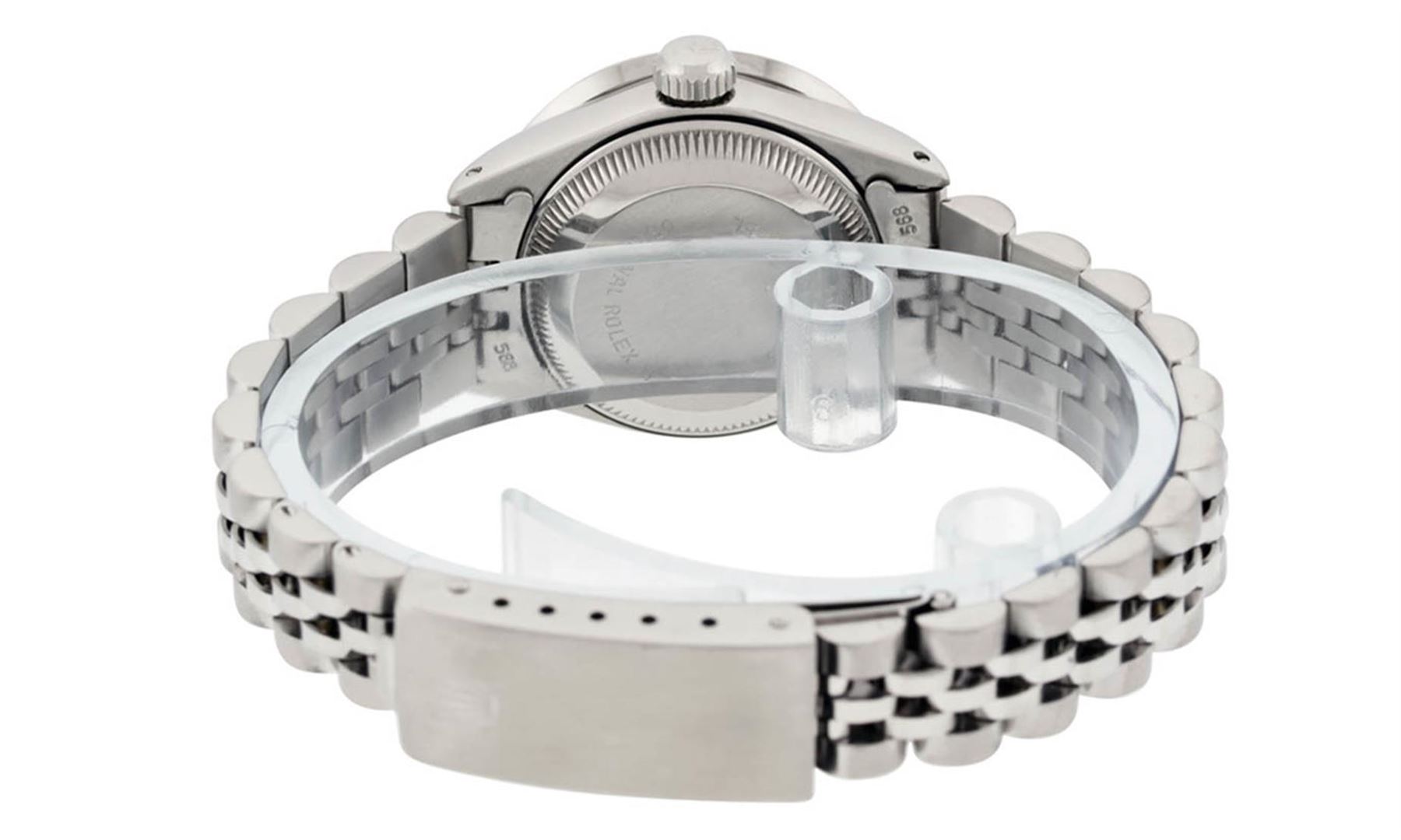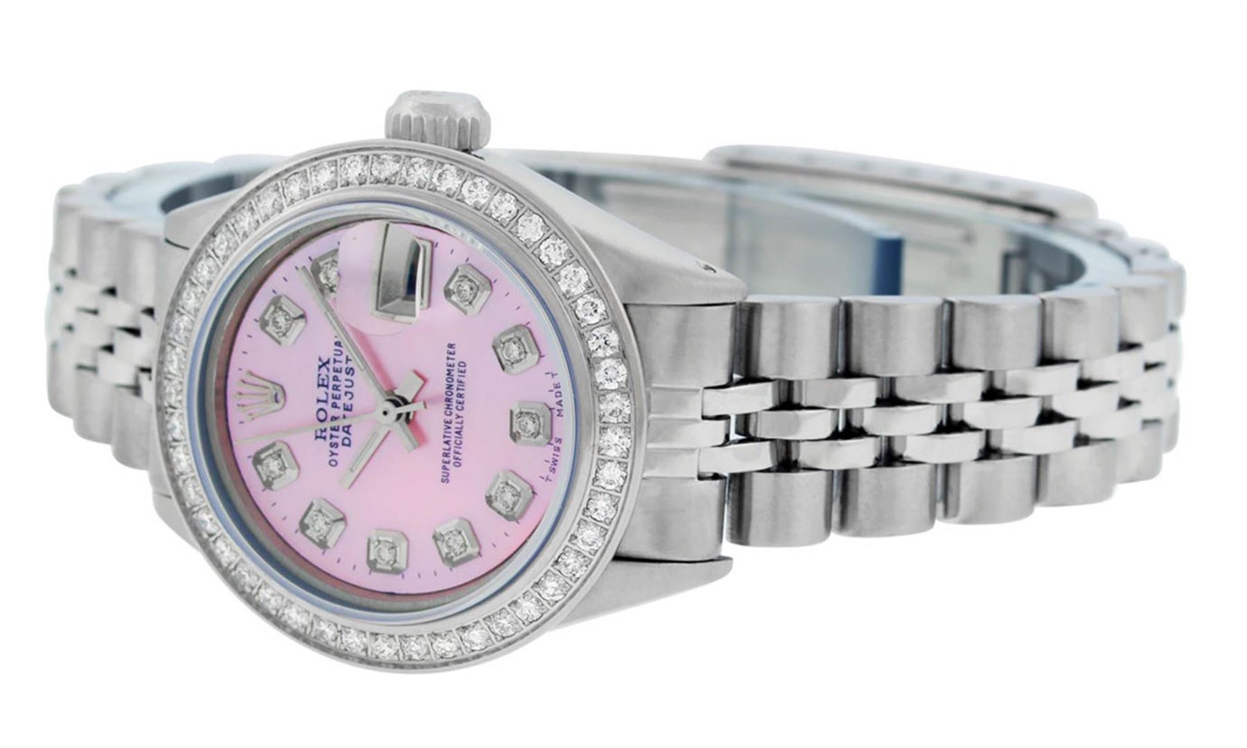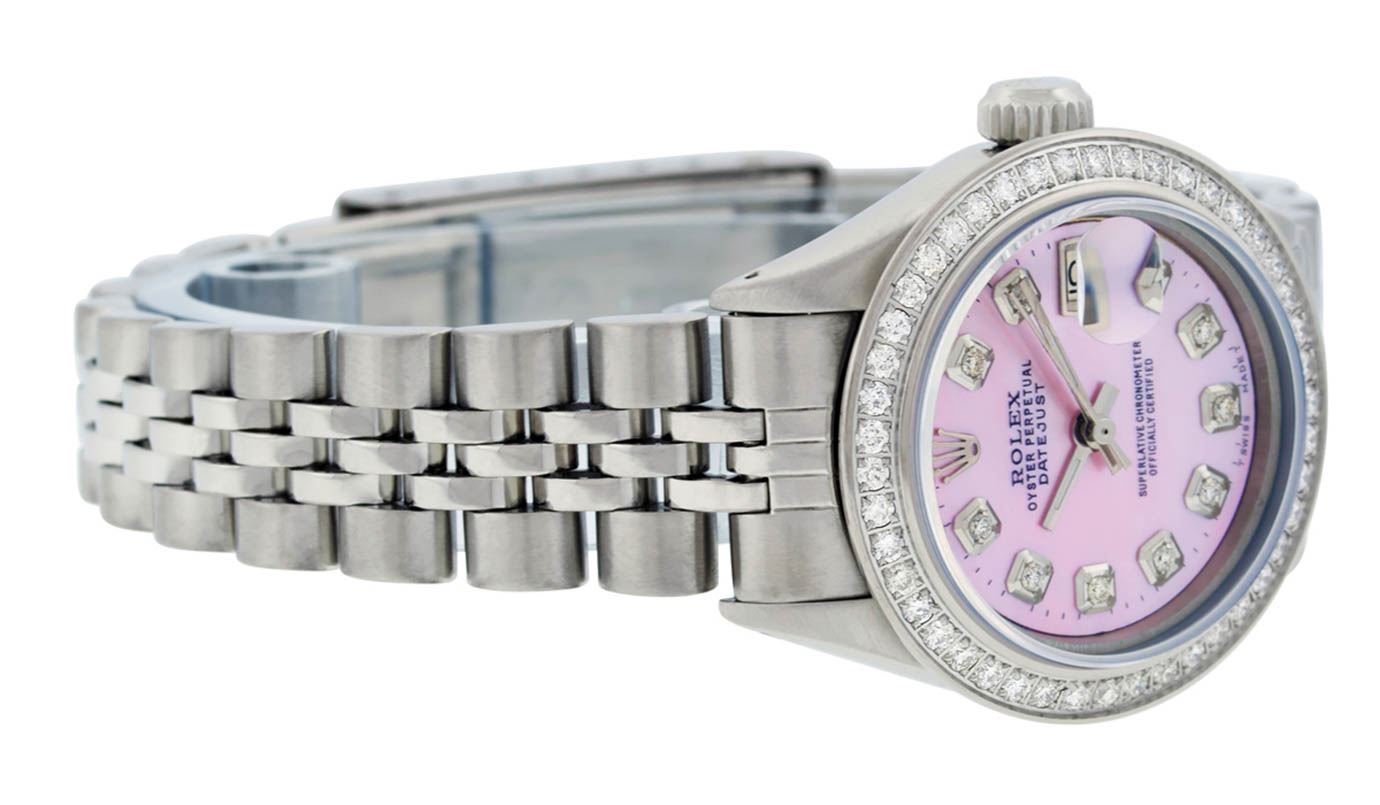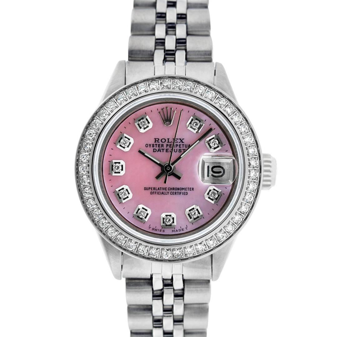 One Ladies Stainless Steel Rolex Datejust Polished Bright with Satin Finish, Serviced & Electronically Tested, Stainless Steel Case: 26mm, Stainless Steel Crown, Custom Bezel: New Stainless Steel Beadset Diamond Bezel, Diamond Count: 44 Diamonds Total Weight 1.00 Carat, Clarity: SI-VS, Color: G to H. Custom Crystal: New Synthetic Sapphire Cyclops Lens. Custom Hands: New Luminescent Hands. Movement: Automatic Winding Movement Caliber 2030. Custom Dial: Refinished Pink Mother Of Pearl With Diamond Hour Markers, Diamond Count: 10 Diamonds in Dial G To H In Color, Clarity: SI-VS. Date Window: 3 O'Clock Position Date Display, Model: Datejust. Condition: G-6 Extra Fine. Bracelet: Stainless Steel Jubilee Band. Bright Polish & Satin Finish. 6.0 Inch Length, Adjustable. Standard Clasp, With Rolex Logo. This Watch Has Been Serviced Time Tested And Is In Excellent Condition It Is Free Of All Scratches And Dents.