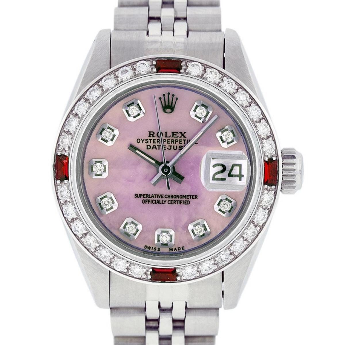 One Ladies Stainless Steel Rolex Datejust Polished Bright with Satin Finish, Serviced & Electronically Tested, Stainless Steel Case: 26mm, Stainless Steel Crown, Custom Bezel: New 18K White Gold Ruby Beadset Diamond Bezel, Diamond + Gem Count: 28 Diamonds + 4 Rubies. Total Weight .70 Carat, Clarity: SI-VS, Color: G to H. Custom Crystal: New Scratch Resistant Synthetic Sapphire Cyclops Lens. Custom Hands: New Luminescent Hands. Movement: Automatic Winding Movement. Custom Dial: Refinished Pink Mother Of Pearl With Diamond Hour Markers, 10 Diamonds in Dial G To H In Color, Clarity: SI-VS. Date Window: 3 O'Clock Position Date Display, Model: Datejust. Condition: G-6 Extra Fine. Bracelet: Stainless Steel Jubilee Band. Bright Polish & Satin Finish. 6.0 Inch Length, Adjustable. Standard Clasp, With Rolex Logo. This Watch Has Been Serviced Time Tested And Is In Excellent Condition It Is Free Of All Scratches And Dents.
