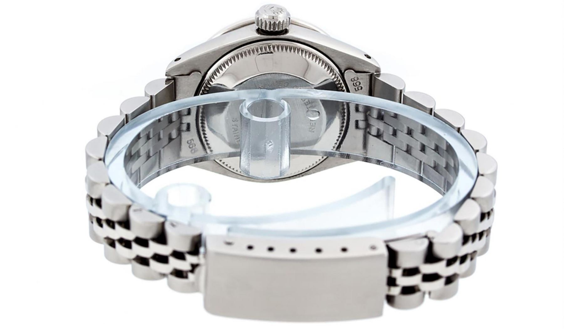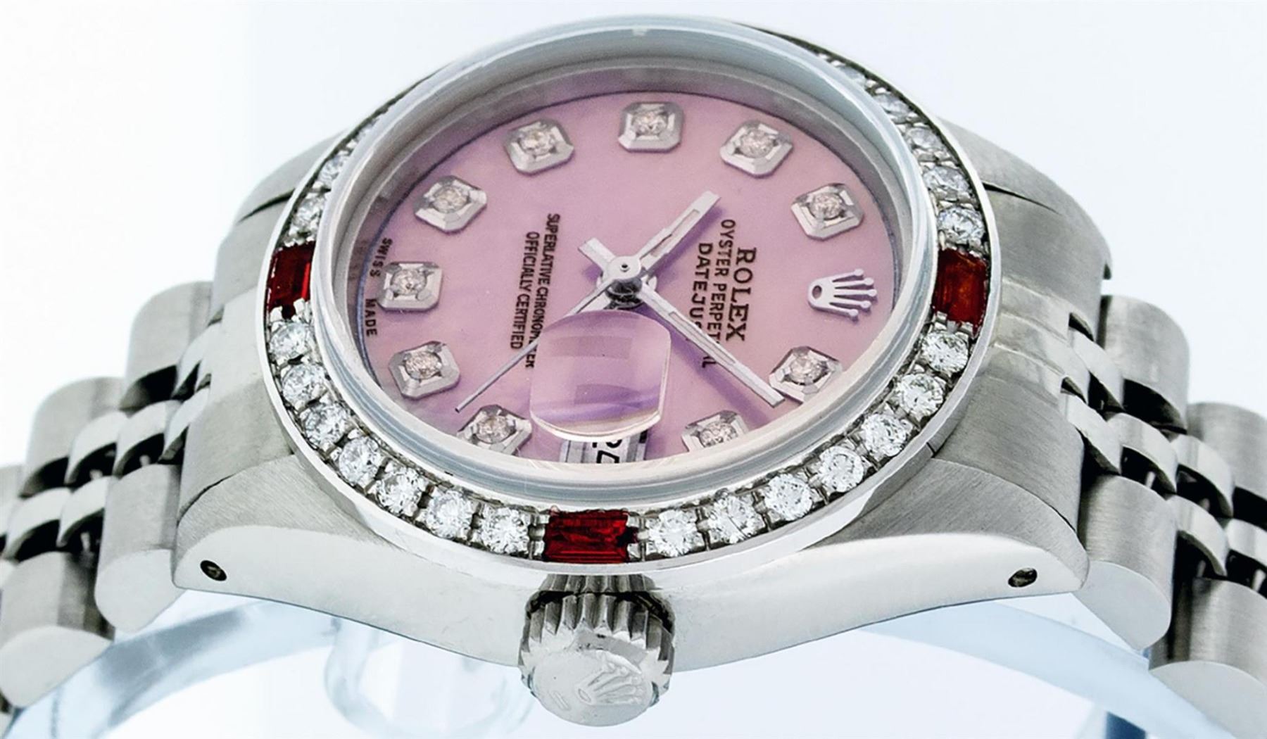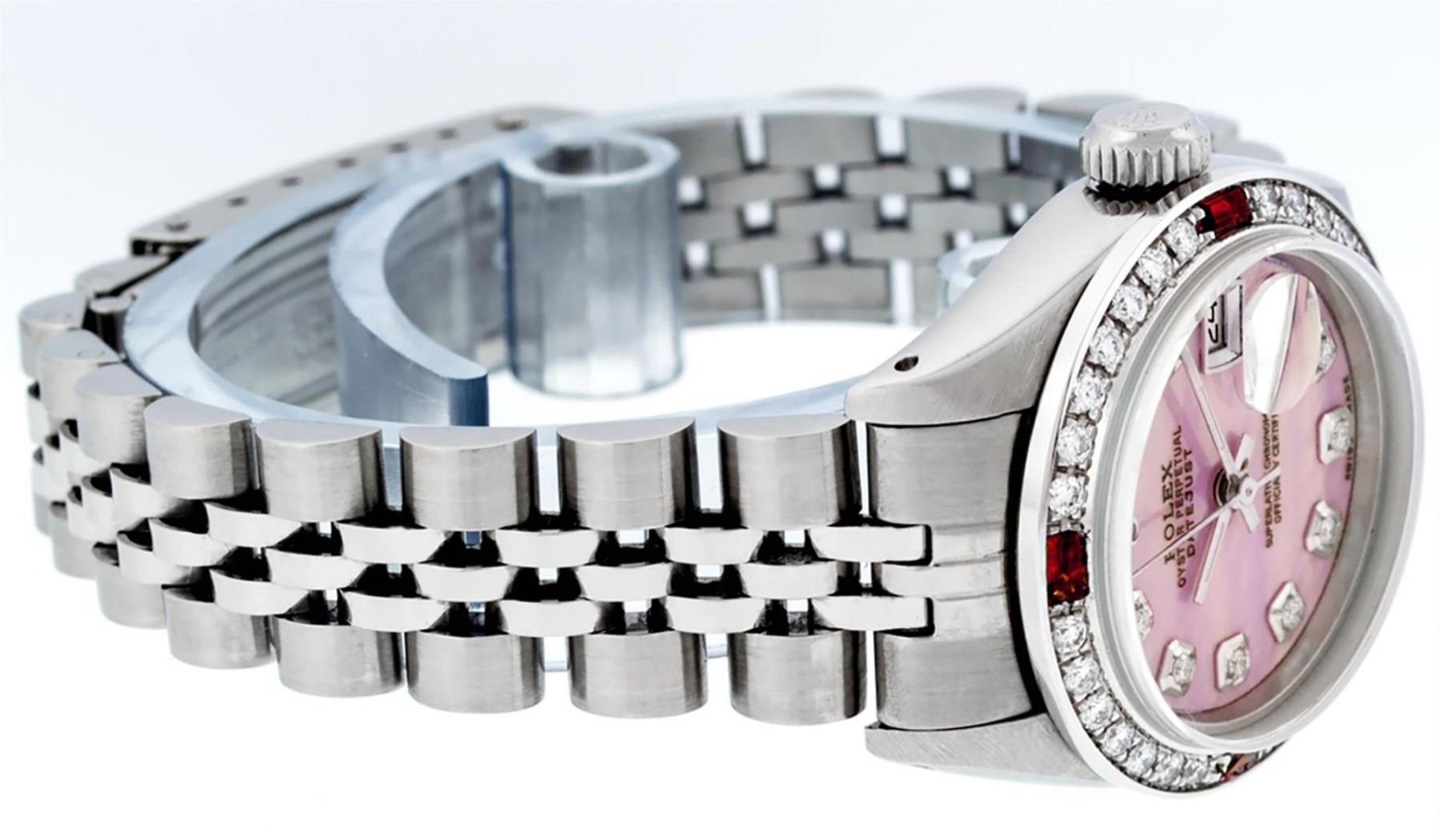 One Ladies Stainless Steel Rolex Datejust Polished Bright with Satin Finish, Serviced & Electronically Tested, Stainless Steel Case: 26mm, Stainless Steel Crown, Custom Bezel: New 18K White Gold Ruby Beadset Diamond Bezel, Diamond + Gem Count: 28 Diamonds + 4 Rubies. Total Weight .70 Carat, Clarity: SI-VS, Color: G to H. Custom Crystal: New Scratch Resistant Synthetic Sapphire Cyclops Lens. Custom Hands: New Luminescent Hands. Movement: Automatic Winding Movement. Custom Dial: Refinished Pink Mother Of Pearl With Diamond Hour Markers, 10 Diamonds in Dial G To H In Color, Clarity: SI-VS. Date Window: 3 O'Clock Position Date Display, Model: Datejust. Condition: G-6 Extra Fine. Bracelet: Stainless Steel Jubilee Band. Bright Polish & Satin Finish. 6.0 Inch Length, Adjustable. Standard Clasp, With Rolex Logo. This Watch Has Been Serviced Time Tested And Is In Excellent Condition It Is Free Of All Scratches And Dents.