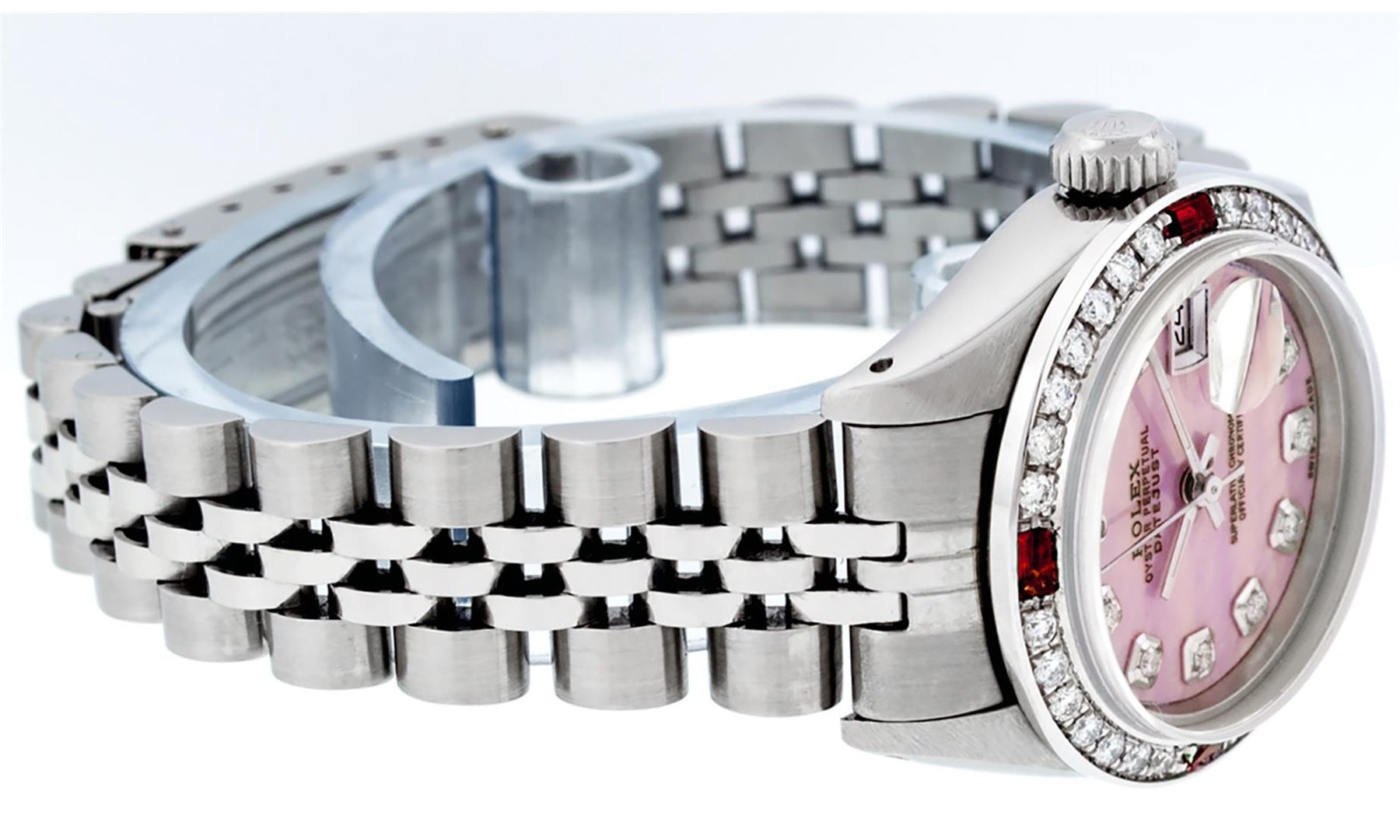 One Ladies Stainless Steel Rolex Datejust Polished Bright with Satin Finish, Serviced & Electronically Tested, Stainless Steel Case: 26mm, Stainless Steel Crown, Custom Bezel: New 18K White Gold Ruby Beadset Diamond Bezel, Diamond + Gem Count: 28 Diamonds + 4 Rubies. Total Weight .70 Carat, Clarity: SI-VS, Color: G to H. Custom Crystal: New Scratch Resistant Synthetic Sapphire Cyclops Lens. Custom Hands: New Luminescent Hands. Movement: Automatic Winding Movement. Custom Dial: Refinished Pink Mother Of Pearl With Diamond Hour Markers, 10 Diamonds in Dial G To H In Color, Clarity: SI-VS. Date Window: 3 O'Clock Position Date Display, Model: Datejust. Condition: G-6 Extra Fine. Bracelet: Stainless Steel Jubilee Band. Bright Polish & Satin Finish. 6.0 Inch Length, Adjustable. Standard Clasp, With Rolex Logo. This Watch Has Been Serviced Time Tested And Is In Excellent Condition It Is Free Of All Scratches And Dents.