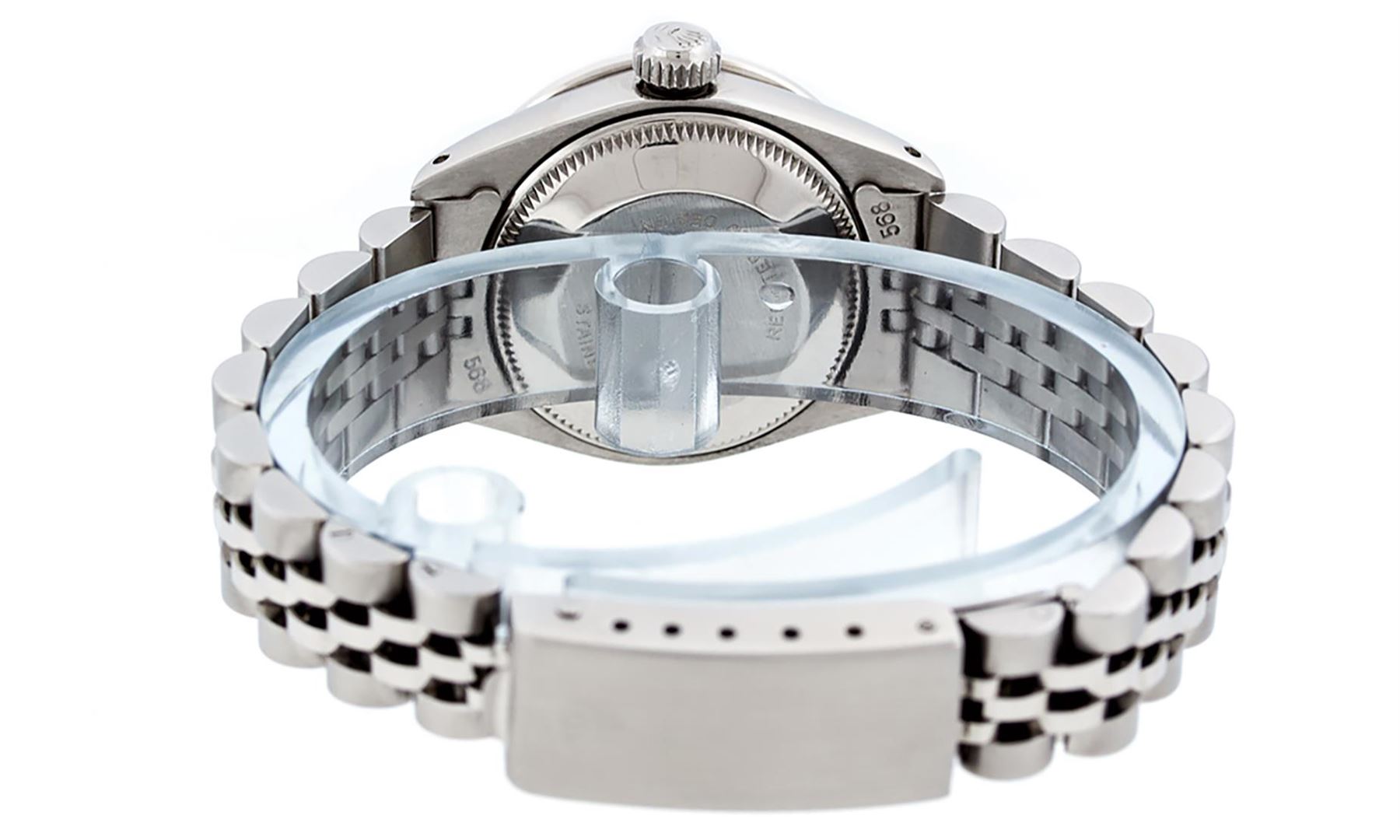 One Ladies Pre Owned Stainless Steel Rolex Datejust Polished Bright with Satin Finish, Serviced & Electronically Tested, Stainless Steel Case: 26mm, Stainless Steel Crown, Custom Bezel: New 18K White Gold Ruby Beadset Diamond Bezel, Diamond + Gem Count: 28 Diamonds + 4 Rubies. Clarity: SI-VS, Color: G to H. Custom Crystal: New Sapphire With Date Window. Custom Hands: New Luminescent Hands. Rolex Movement: Automatic Winding Movement. Custom Dial: Pink Mother Of Pearl With Custom Added Diamond Hour Markers, 10 Diamonds in Dial G To H In Color, Clarity: SI-VS. Date Window: 3 O'Clock Position Date Display, Model: Datejust. Condition: G-6 Extra Fine. Rolex Bracelet: Stainless Steel Jubilee Band. Bright Polish & Satin Finish. 6.0 Inch Length, Adjustable. Standard Clasp, With Rolex Logo. This Watch Has Been Serviced Time Tested And Is In Excellent Condition It Is Free Of All Scratches And Dents.