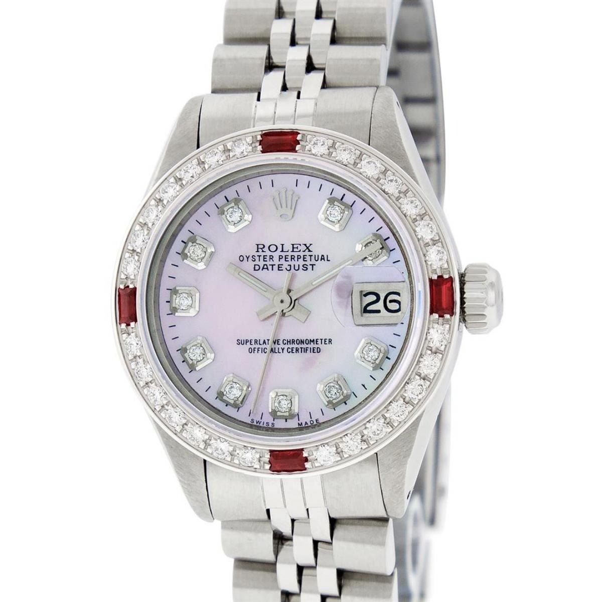 One Ladies Stainless Steel Rolex Datejust Polished Bright with Satin Finish, Serviced & Electronically Tested, Stainless Steel Case: 26mm, Stainless Steel Crown, Custom Bezel: New 18K White Gold Ruby Beadset Diamond Bezel, Diamond + Gem Count: 28 Diamonds + 4 Rubies Total Weight .70 Carat, Clarity: SI-VS, Color: G to H. Custom Crystal: New Synthetic Sapphire Cyclops Lens. Custom Hands: New Luminescent Hands. Movement: Automatic Winding Movement Caliber 2030. Custom Dial: Refinished Pink Mother Of Pearl With Diamond Hour Markers, 10 Diamond in Dial G To H In Color, Clarity: SI-VS. Date Window: 3 O'Clock Position Date Display, Model: Datejust. Condition: G-6 Extra Fine. Bracelet: Stainless Steel Jubilee. Bright Polish & Satin Finish. 6.0 Inch Length, Adjustable. Standard Clasp, With Rolex Logo. This Watch Has Been Serviced Time Tested And Is In Excellent Condition It Is Free Of All Scratches And Dents.