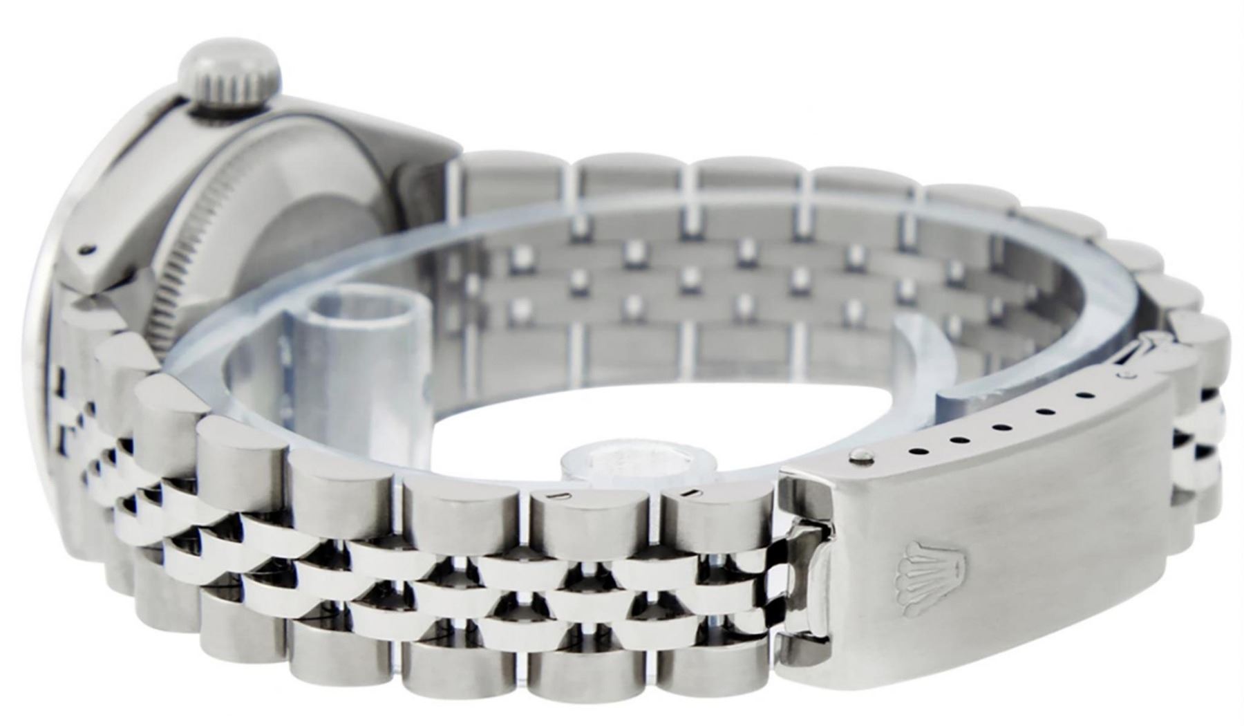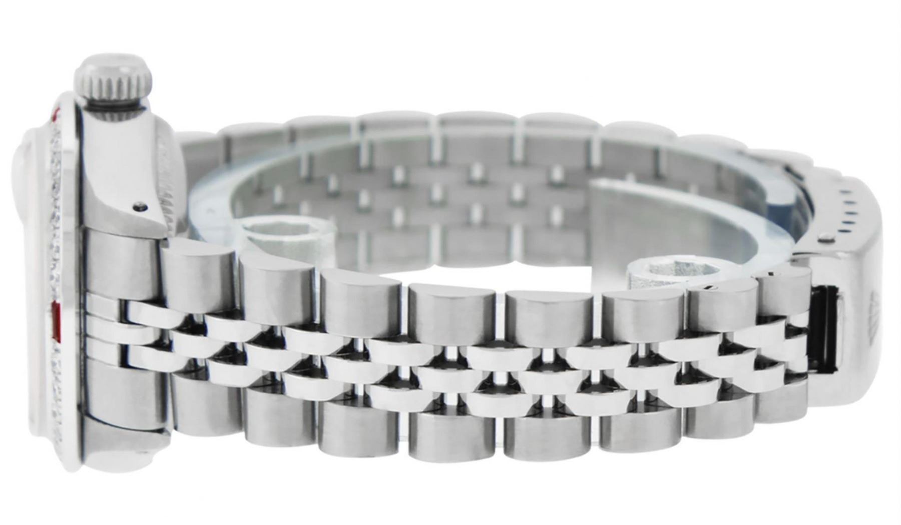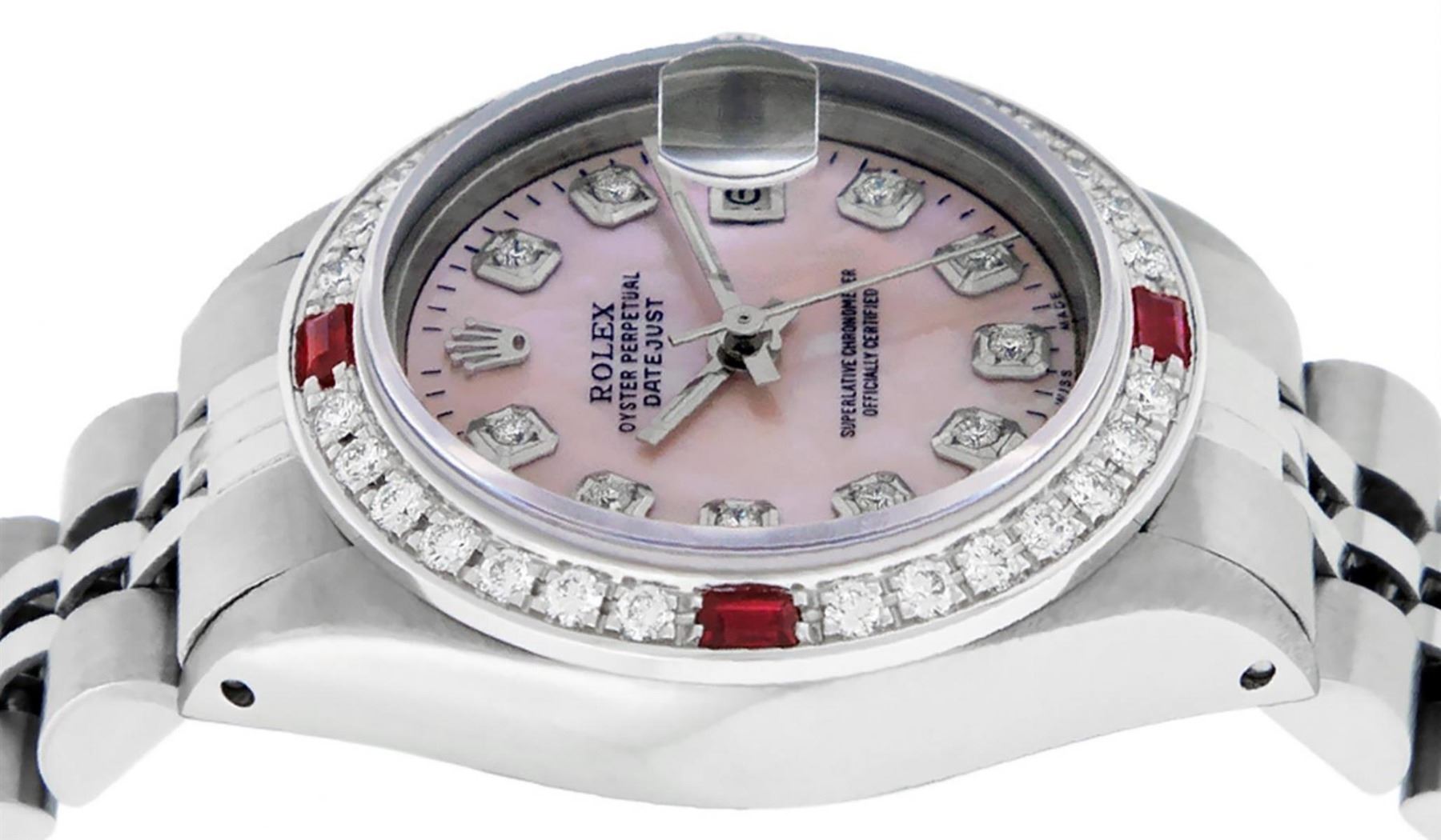 One Ladies Stainless Steel Rolex Datejust Polished Bright with Satin Finish, Serviced & Electronically Tested, Stainless Steel Case: 26mm, Stainless Steel Crown, Custom Bezel: New 18K White Gold Ruby Beadset Diamond Bezel, Diamond + Gem Count: 28 Diamonds + 4 Rubies Total Weight .70 Carat, Clarity: SI-VS, Color: G to H. Custom Crystal: New Synthetic Sapphire Cyclops Lens. Custom Hands: New Luminescent Hands. Movement: Automatic Winding Movement. Custom Dial: Refinished Pink Mother Of Pearl With Diamond Hour Markers, 10 Diamond in Dial G To H In Color, Clarity: SI-VS. Date Window: 3 O'Clock Position Date Display, Model: Datejust. Condition: G-6 Extra Fine. Bracelet: Stainless Steel Jubilee. Bright Polish & Satin Finish. 6.0 Inch Length, Adjustable. Standard Clasp, With Rolex Logo. This Watch Has Been Serviced Time Tested And Is In Excellent Condition It Is Free Of All Scratches And Dents.