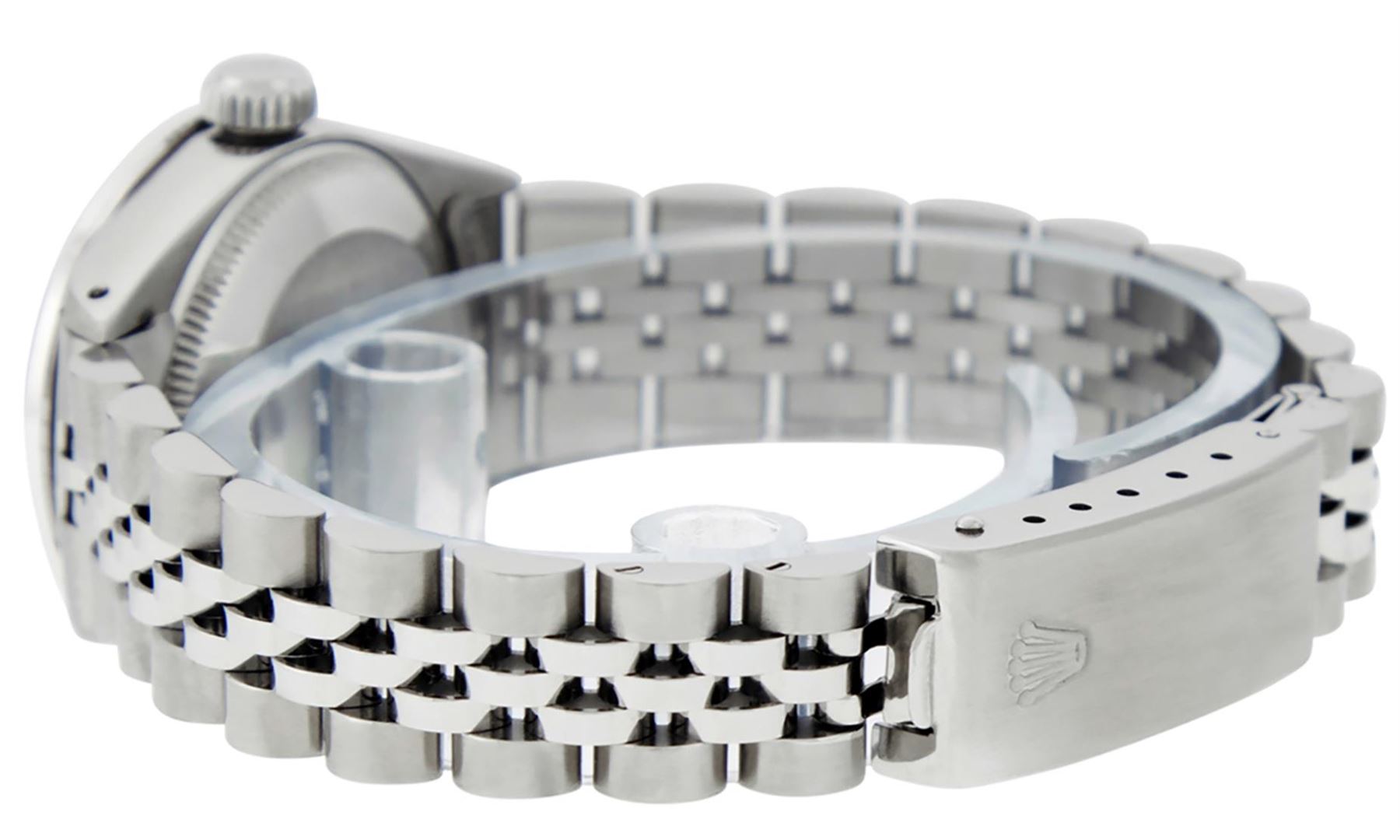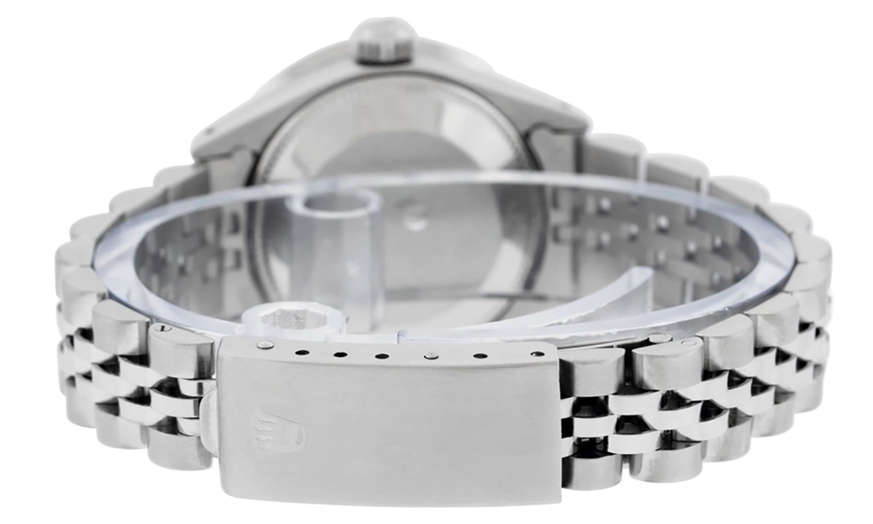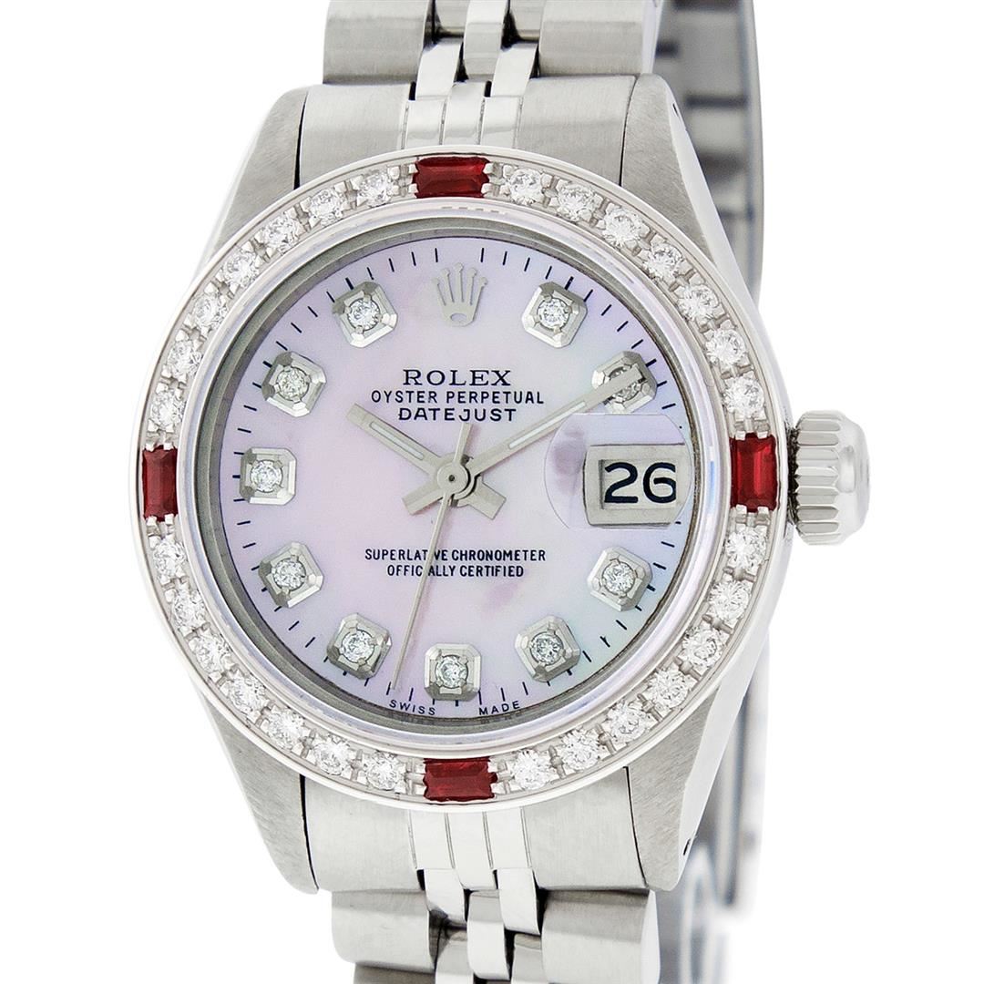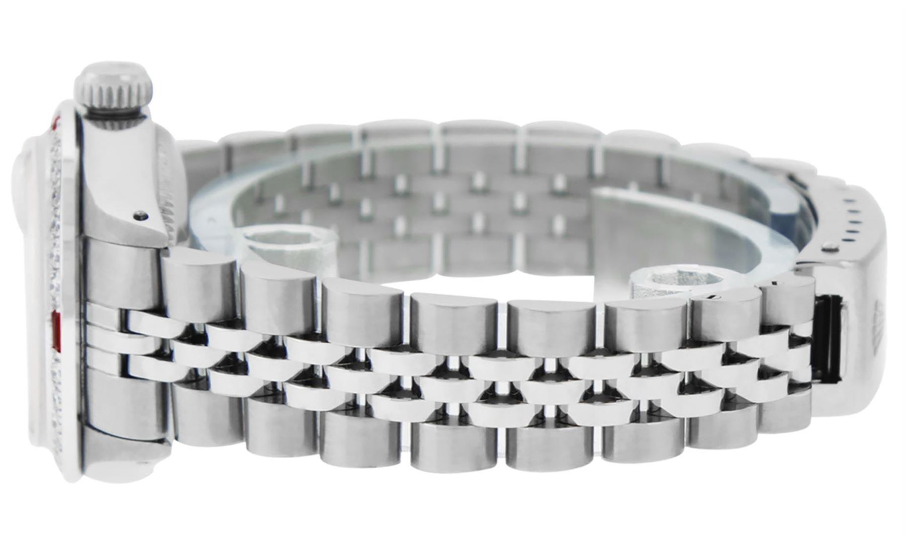 One Ladies Stainless Steel Rolex Oyster Perpetual Datejust Polished Bright with Satin Finish, Serviced & Electronically Tested, Stainless Steel Case: 26mm, Stainless Steel Crown, Custom Bezel: New 18K White Gold Ruby Beadset Diamond Bezel, Diamond + Gem Count: 28 Diamonds + 4 Rubies Total Weight .70 Carat, Clarity: SI-VS, Color: G to H. Custom Crystal: New Scratch Resistant Synthetic Sapphire Cyclops Lens. Custom Hands: New Luminescent Hands. Movement: Automatic Winding Movement. Custom Dial: Refinished Pink Mother Of Pearl With Diamond Hour Markers, 10 Diamond in Dial G To H In Color, Clarity: SI-VS. Date Window: 3 O'clock Position Date Display, Model: Datejust. Condition: G-6 Extra Fine. Bracelet: Stainless Steel Jubilee Band. Bright Polish & Satin Finish. 6.0 Inch Length, Adjustable. Standard Clasp, With Rolex Logo. This Watch Has Been Serviced Time Tested And Is In Excellent Condition It Is Free Of All Scratches And Dents.