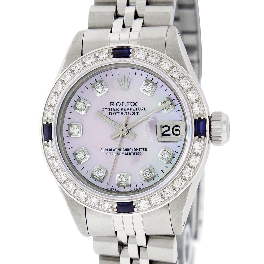 One Ladies Stainless Steel Rolex Datejust Polished Bright with Satin Finish, Serviced & Electronically Tested, Stainless Steel Case: 26mm, Stainless Steel Crown, Custom Bezel: New 18K White Gold Sapphire Beadset Diamond Bezel, Diamond + Gem Count: 28 Diamonds + 4 Sapphires. Total Weight .70 Carat, Clarity: SI-VS, Color: G to H. Custom Crystal: New Synthetic Sapphire Cyclops Lens. Custom Hands: New Luminescent Hands. Movement: Automatic Winding Movement Caliber 2030. Custom Dial: Refinished Pink Mother Of Pearl With Diamond Hour Markers, Diamond Count: 10 Diamond in Dial, G To H In Color, Clarity: SI-VS. Date Window: 3 O'Clock Position Date Display, Model: Datejust. Condition: G-6 Extra Fine. Bracelet: Stainless Steel Jubilee. Bright Polish & Satin Finish. 6.0 Inch Length, Adjustable. Standard Clasp, With Rolex Logo. This Watch Has Been Serviced Time Tested And Is In Excellent Condition It Is Free Of All Scratches And Dents.