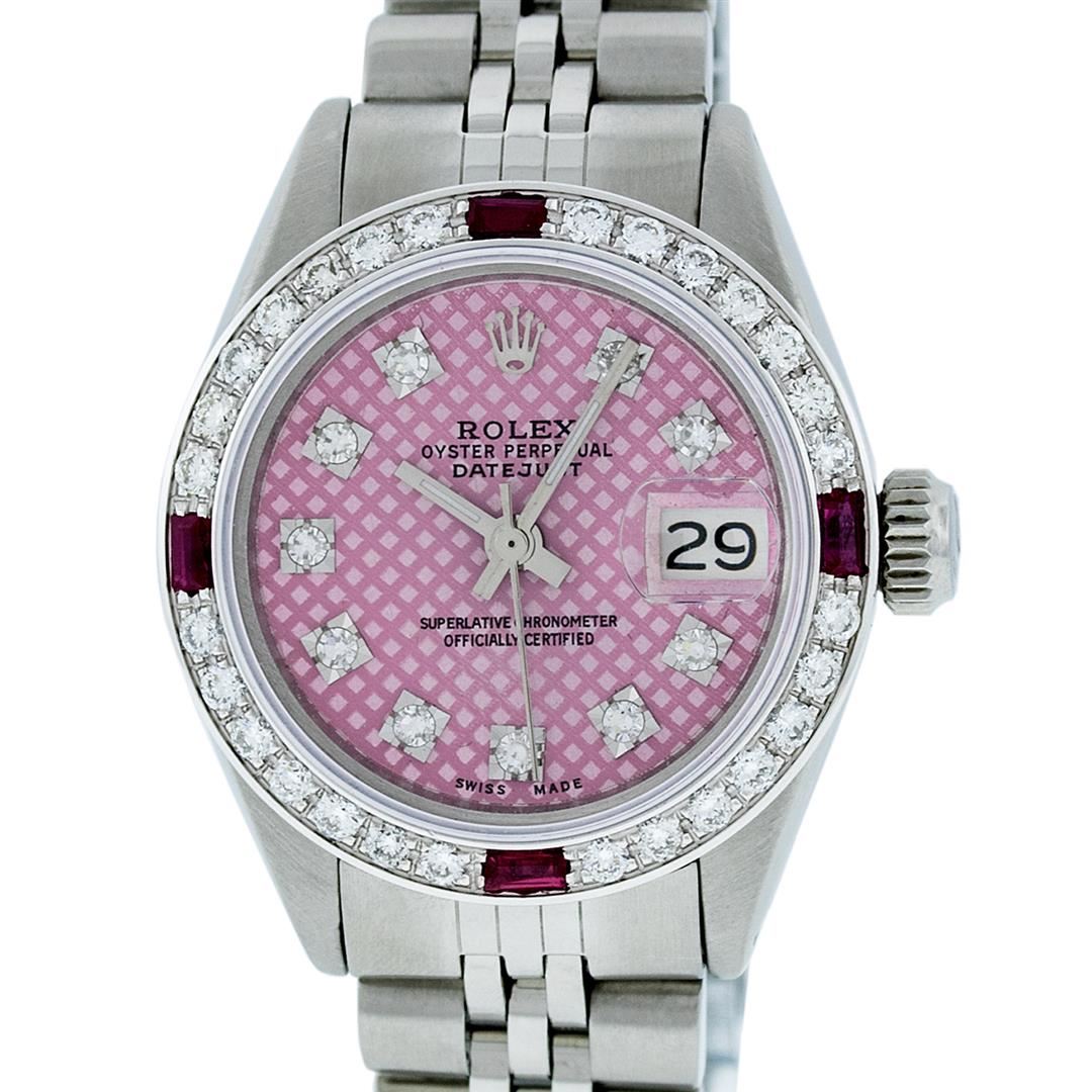 One Ladies Stainless Steel Rolex Datejust Polished Bright with Satin Finish, Serviced & Electronically Tested, Stainless Steel Case: 26mm, Stainless Steel Crown, Custom Bezel: New 18K White Ruby Beadset Diamond Bezel, Diamond + Gem Count: 28 Diamonds + 4 Rubies. Total Weight .70 Carat, Clarity: SI-VS, Color: G to H. Custom Crystal: New Scratch Resistant Synthetic Sapphire Cyclops Lens. Custom Hands: New Luminescent Hands. Movement: Automatic Winding Movement Caliber 2030. Custom Dial: Pink Stamp With Single Cut Diamond Hour Markers, 10 Diamonds in Dial, G To H In Color, Clarity: SI-VS. Date Window: 3 O'Clock Position Date Display, Model: Datejust. Condition: G-6 Extra Fine. Bracelet: Stainless Steel Jubilee Band. Bright Polish & Satin Finish. 6.0 Inch Length, Adjustable. Standard Clasp, With Rolex Logo. This Watch Has Been Serviced Time Tested And Is In Excellent Condition It Is Free Of All Scratches And Dents.