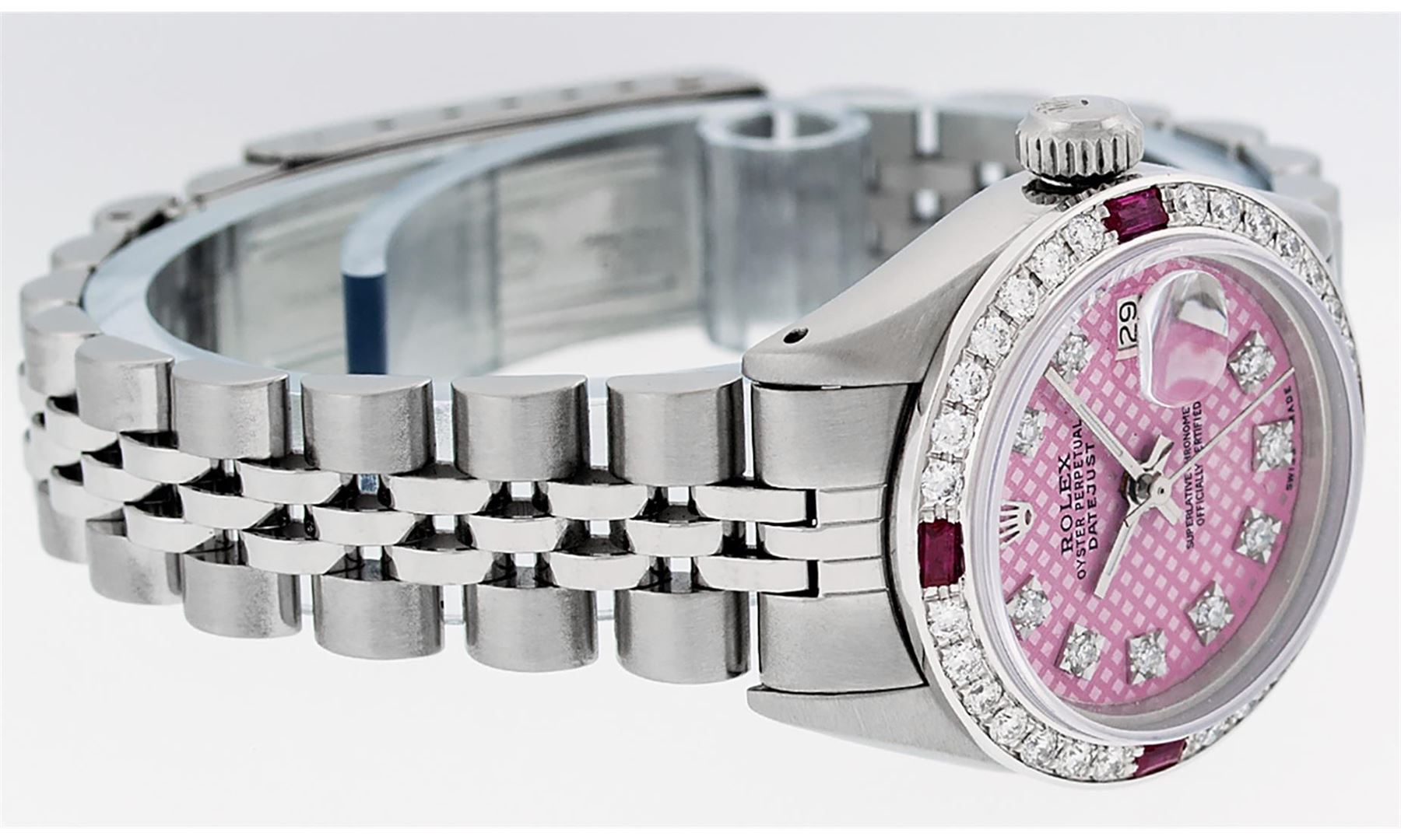 One Ladies Stainless Steel Rolex Datejust Polished Bright with Satin Finish, Serviced & Electronically Tested, Stainless Steel Case: 26mm, Stainless Steel Crown, Custom Bezel: New 18K White Ruby Beadset Diamond Bezel, Diamond + Gem Count: 28 Diamonds + 4 Rubies. Total Weight .70 Carat, Clarity: SI-VS, Color: G to H. Custom Crystal: New Scratch Resistant Synthetic Sapphire Cyclops Lens. Custom Hands: New Luminescent Hands. Movement: Automatic Winding Movement Caliber 2030. Custom Dial: Pink Stamp With Single Cut Diamond Hour Markers, 10 Diamonds in Dial, G To H In Color, Clarity: SI-VS. Date Window: 3 O'Clock Position Date Display, Model: Datejust. Condition: G-6 Extra Fine. Bracelet: Stainless Steel Jubilee Band. Bright Polish & Satin Finish. 6.0 Inch Length, Adjustable. Standard Clasp, With Rolex Logo. This Watch Has Been Serviced Time Tested And Is In Excellent Condition It Is Free Of All Scratches And Dents.