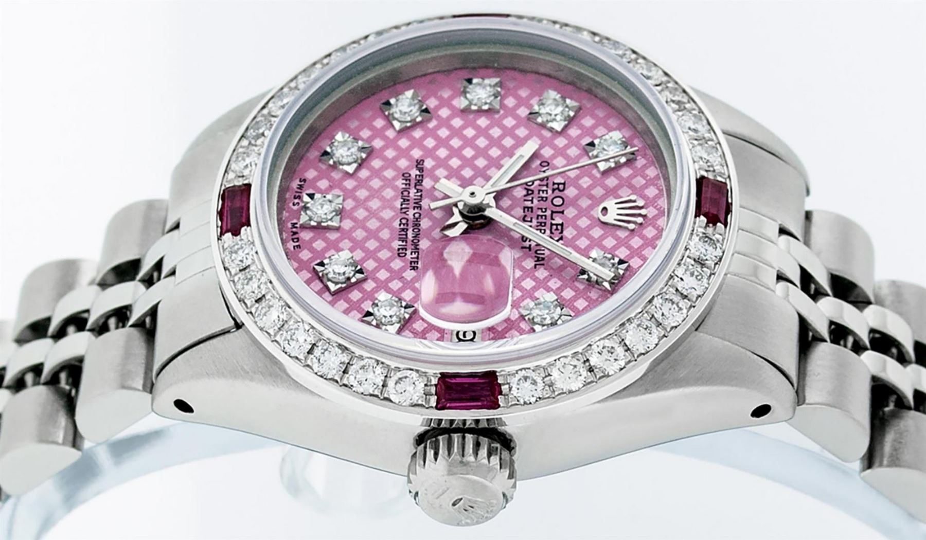 One Ladies Stainless Steel Rolex Datejust Polished Bright with Satin Finish, Serviced & Electronically Tested, Stainless Steel Case: 26mm, Stainless Steel Crown, Custom Bezel: New 18K White Ruby Beadset Diamond Bezel, Diamond + Gem Count: 28 Diamonds + 4 Rubies. Total Weight .70 Carat, Clarity: SI-VS, Color: G to H. Custom Crystal: New Scratch Resistant Synthetic Sapphire Cyclops Lens. Custom Hands: New Luminescent Hands. Movement: Automatic Winding Movement Caliber 2030. Custom Dial: Pink Stamp With Single Cut Diamond Hour Markers, 10 Diamonds in Dial, G To H In Color, Clarity: SI-VS. Date Window: 3 O'Clock Position Date Display, Model: Datejust. Condition: G-6 Extra Fine. Bracelet: Stainless Steel Jubilee Band. Bright Polish & Satin Finish. 6.0 Inch Length, Adjustable. Standard Clasp, With Rolex Logo. This Watch Has Been Serviced Time Tested And Is In Excellent Condition It Is Free Of All Scratches And Dents.