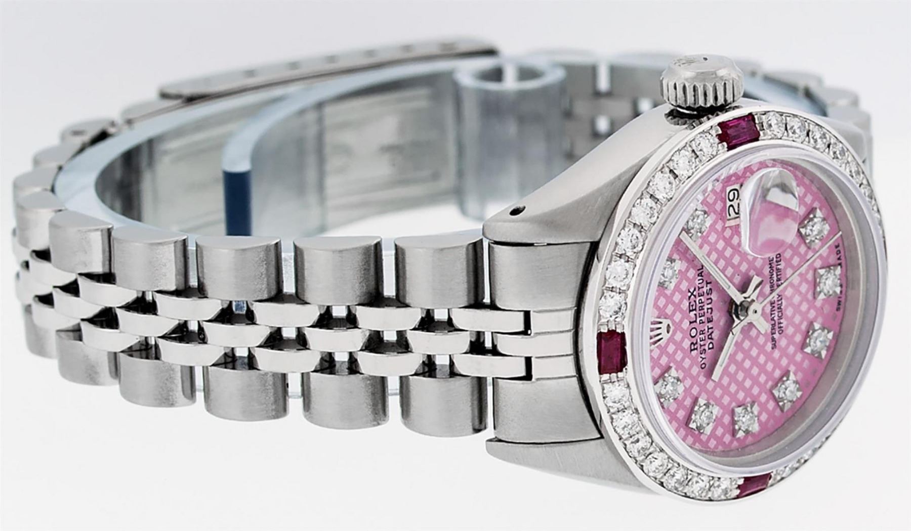 One Ladies Stainless Steel Rolex Datejust Polished Bright with Satin Finish, Serviced & Electronically Tested, Stainless Steel Case: 26mm, Stainless Steel Crown, Custom Bezel: New 18K White Ruby Beadset Diamond Bezel, Diamond + Gem Count: 28 Diamonds + 4 Rubies. Total Weight .70 Carat, Clarity: SI-VS, Color: G to H. Custom Crystal: New Scratch Resistant Synthetic Sapphire Cyclops Lens. Custom Hands: New Luminescent Hands. Movement: Automatic Winding Movement Caliber 2030. Custom Dial: Pink Stamp With Single Cut Diamond Hour Markers, 10 Diamonds in Dial, G To H In Color, Clarity: SI-VS. Date Window: 3 O'Clock Position Date Display, Model: Datejust. Condition: G-6 Extra Fine. Bracelet: Stainless Steel Jubilee Band. Bright Polish & Satin Finish. 6.0 Inch Length, Adjustable. Standard Clasp, With Rolex Logo. This Watch Has Been Serviced Time Tested And Is In Excellent Condition It Is Free Of All Scratches And Dents.