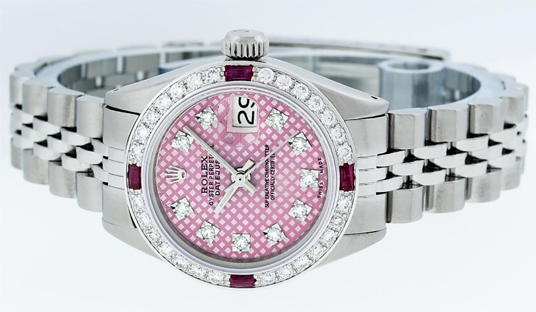 One Ladies Stainless Steel Rolex Datejust Polished Bright with Satin Finish, Serviced & Electronically Tested, Stainless Steel Case: 26mm, Stainless Steel Crown, Custom Bezel: New 18K White Ruby Beadset Diamond Bezel, Diamond + Gem Count: 28 Diamonds + 4 Rubies. Total Weight .70 Carat, Clarity: SI-VS, Color: G to H. Custom Crystal: New Scratch Resistant Synthetic Sapphire Cyclops Lens. Custom Hands: New Luminescent Hands. Movement: Automatic Winding Movement Caliber 2030. Custom Dial: Pink Stamp With Single Cut Diamond Hour Markers, 10 Diamonds in Dial, G To H In Color, Clarity: SI-VS. Date Window: 3 O'Clock Position Date Display, Model: Datejust. Condition: G-6 Extra Fine. Bracelet: Stainless Steel Jubilee Band. Bright Polish & Satin Finish. 6.0 Inch Length, Adjustable. Standard Clasp, With Rolex Logo. This Watch Has Been Serviced Time Tested And Is In Excellent Condition It Is Free Of All Scratches And Dents.
