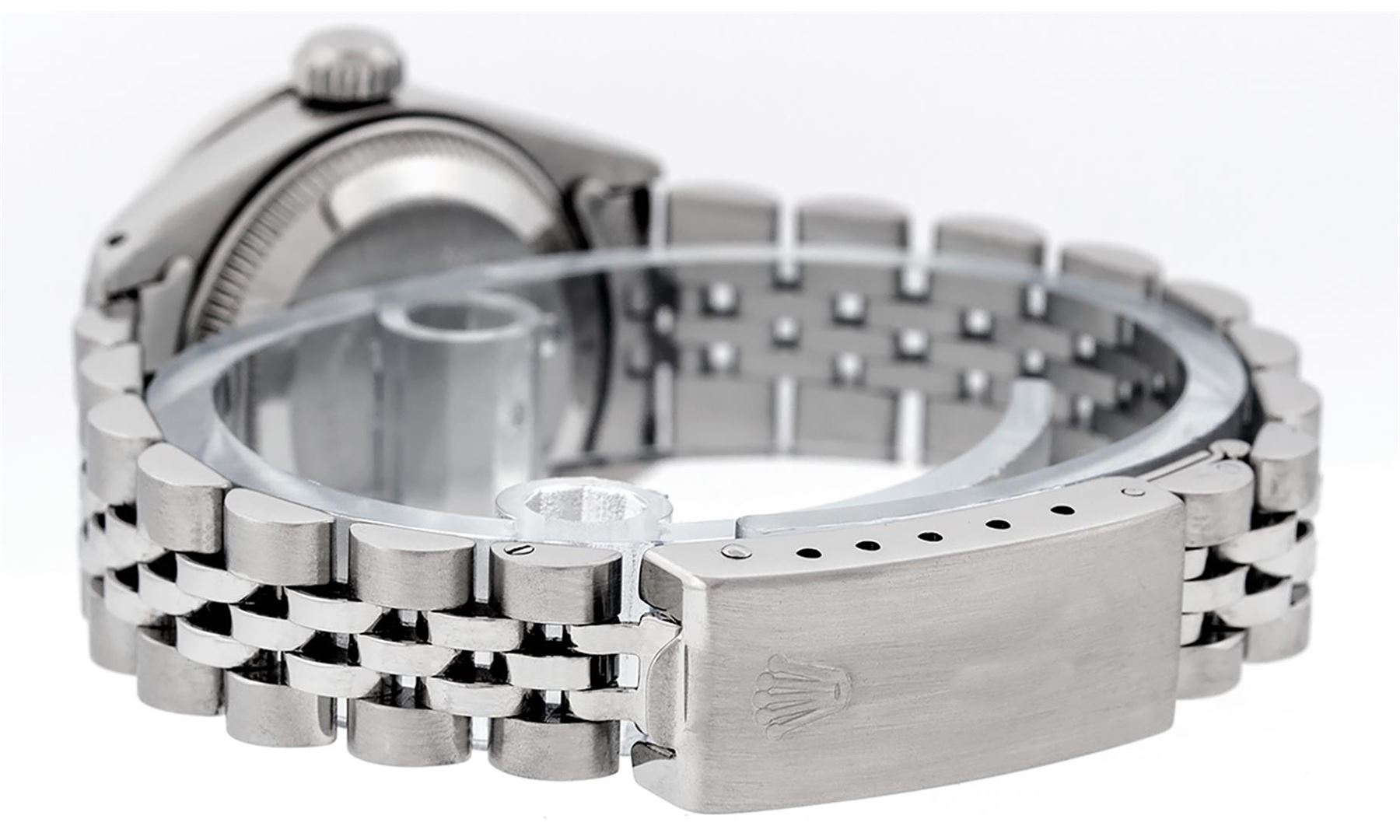 One Ladies Stainless Steel Rolex Datejust Polished Bright with Satin Finish, Serviced & Electronically Tested, Stainless Steel Case: 26mm, Stainless Steel Crown, Custom Bezel: New 18K White Ruby Beadset Diamond Bezel, Diamond + Gem Count: 28 Diamonds + 4 Rubies. Total Weight .70 Carat, Clarity: SI-VS, Color: G to H. Custom Crystal: New Scratch Resistant Synthetic Sapphire Cyclops Lens. Custom Hands: New Luminescent Hands. Movement: Automatic Winding Movement. Custom Dial: Pink Stamp With Single Cut Diamond Hour Markers, 10 Diamonds in Dial, G To H In Color, Clarity: SI-VS. Date Window: 3 O'Clock Position Date Display, Model: Datejust. Condition: G-6 Extra Fine. Bracelet: Stainless Steel Jubilee Band. Bright Polish & Satin Finish. 6.0 Inch Length, Adjustable. Standard Clasp, With Rolex Logo. This Watch Has Been Serviced Time Tested And Is In Excellent Condition It Is Free Of All Scratches And Dents.