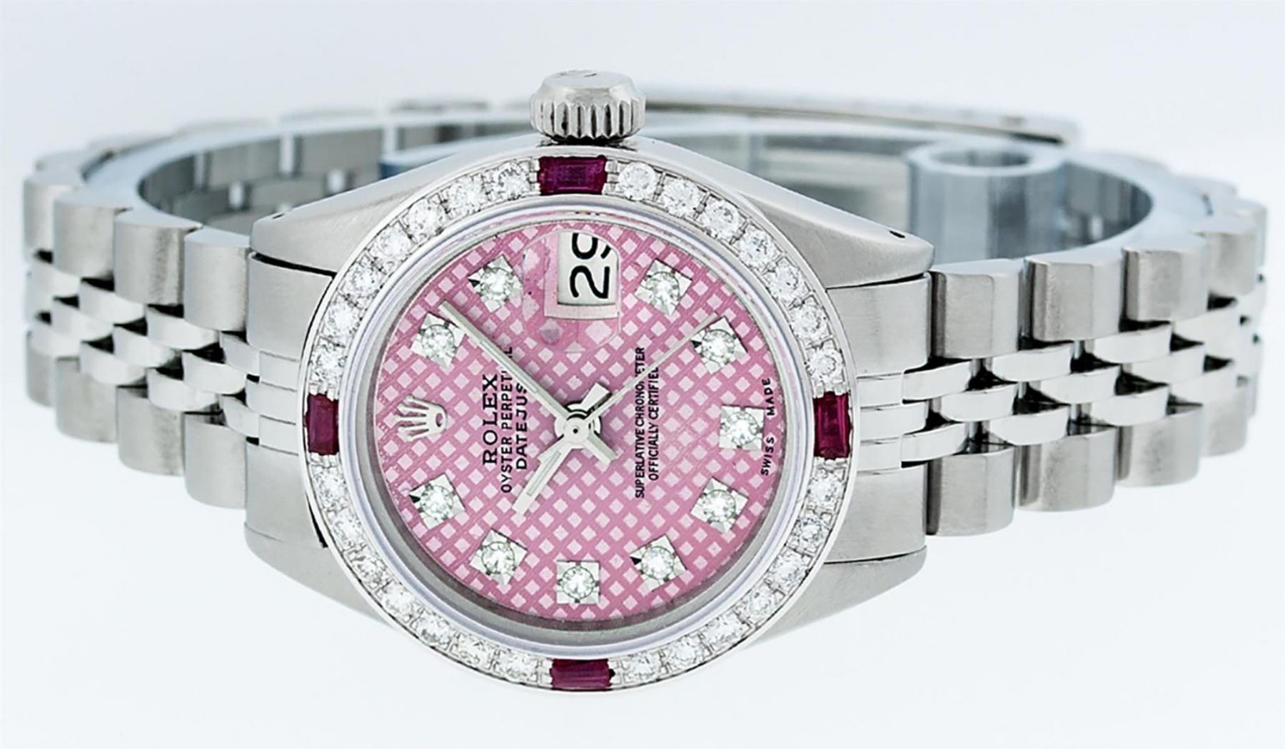One Ladies Stainless Steel Rolex Datejust Polished Bright with Satin Finish, Serviced & Electronically Tested, Stainless Steel Case: 26mm, Stainless Steel Crown, Custom Bezel: New 18K White Ruby Beadset Diamond Bezel, Diamond + Gem Count: 28 Diamonds + 4 Rubies. Total Weight .70 Carat, Clarity: SI-VS, Color: G to H. Custom Crystal: New Scratch Resistant Synthetic Sapphire Cyclops Lens. Custom Hands: New Luminescent Hands. Movement: Automatic Winding Movement. Custom Dial: Pink Stamp With Single Cut Diamond Hour Markers, 10 Diamonds in Dial, G To H In Color, Clarity: SI-VS. Date Window: 3 O'Clock Position Date Display, Model: Datejust. Condition: G-6 Extra Fine. Bracelet: Stainless Steel Jubilee Band. Bright Polish & Satin Finish. 6.0 Inch Length, Adjustable. Standard Clasp, With Rolex Logo. This Watch Has Been Serviced Time Tested And Is In Excellent Condition It Is Free Of All Scratches And Dents.