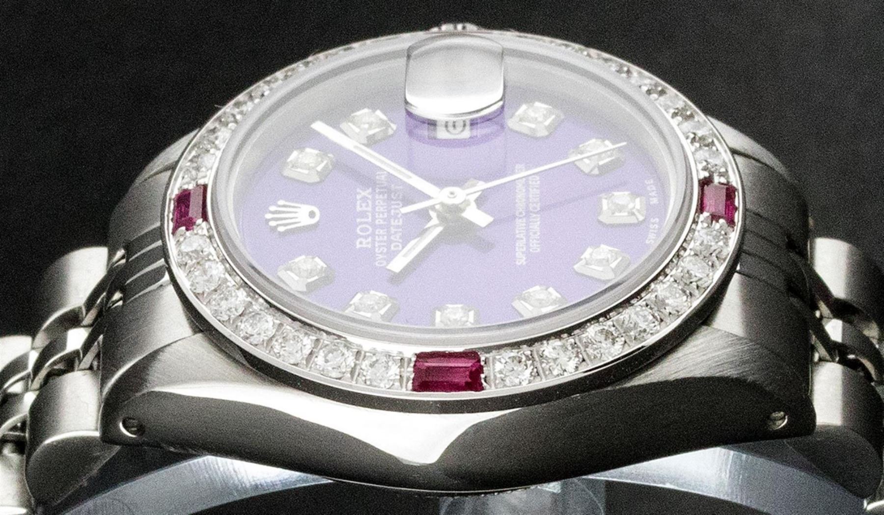 One Ladies Stainless Steel Rolex Datejust Polished Bright with Satin Finish, Serviced & Electronically Tested, Stainless Steel Case: 26mm, Stainless Steel Crown, Custom Bezel: New 18K White Gold Ruby Beadset Diamond Bezel, Diamond + Gem Count: 28 Diamonds + 4 Rubies. Total Weight .70 Carat, Clarity: SI-VS, Color: G to H. Custom Crystal: New Synthetic Scratch Resistant Sapphire Cyclops Lens. Custom Hands: New Luminescent Hands. Movement: Automatic Winding Movement Caliber 2030. Custom Dial: Refinished Purple With Diamond Hour Markers, Diamond Count: 10 Diamond in Dial, G To H In Color, Clarity: SI-VS. Date Window: 3 O'Clock Position Date Display, Model: Datejust. Condition: G-6 Extra Fine. Bracelet: Stainless Steel Jubilee. Bright Polish & Satin Finish. 6.0 Inch Length, Adjustable. Standard Clasp, With Rolex Logo. This Watch Has Been Serviced Time Tested And Is In Excellent Condition It Is Free Of All Scratches And Dents.