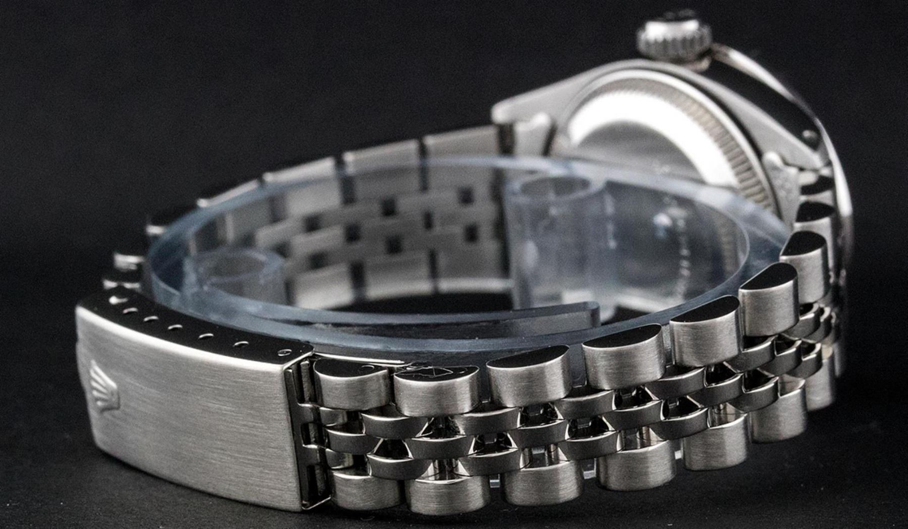 One Ladies Stainless Steel Rolex Datejust Polished Bright with Satin Finish, Serviced & Electronically Tested, Stainless Steel Case: 26mm, Stainless Steel Crown, Custom Bezel: New 18K White Gold Ruby Beadset Diamond Bezel, Diamond + Gem Count: 28 Diamonds + 4 Rubies. Total Weight .70 Carat, Clarity: SI-VS, Color: G to H. Custom Crystal: New Synthetic Scratch Resistant Sapphire Cyclops Lens. Custom Hands: New Luminescent Hands. Movement: Automatic Winding Movement Caliber 2030. Custom Dial: Refinished Purple With Diamond Hour Markers, Diamond Count: 10 Diamond in Dial, G To H In Color, Clarity: SI-VS. Date Window: 3 O'Clock Position Date Display, Model: Datejust. Condition: G-6 Extra Fine. Bracelet: Stainless Steel Jubilee. Bright Polish & Satin Finish. 6.0 Inch Length, Adjustable. Standard Clasp, With Rolex Logo. This Watch Has Been Serviced Time Tested And Is In Excellent Condition It Is Free Of All Scratches And Dents.