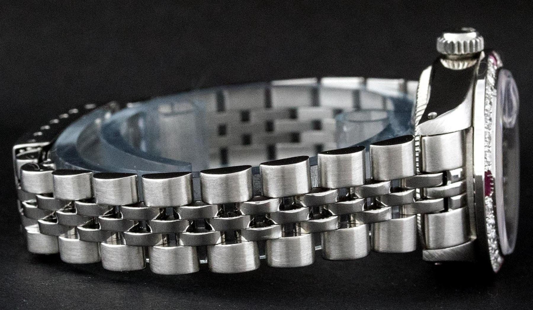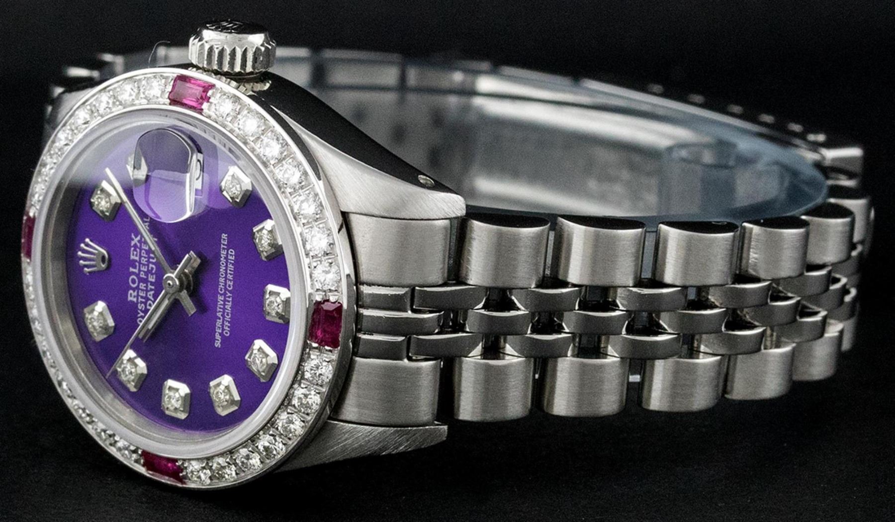 One Ladies Stainless Steel Rolex Datejust Polished Bright with Satin Finish, Serviced & Electronically Tested, Stainless Steel Case: 26mm, Stainless Steel Crown, Custom Bezel: New 18K White Gold Ruby Beadset Diamond Bezel, Diamond + Gem Count: 28 Diamonds + 4 Rubies. Total Weight .70 Carat, Clarity: SI-VS, Color: G to H. Custom Crystal: New Synthetic Scratch Resistant Sapphire Cyclops Lens. Custom Hands: New Luminescent Hands. Movement: Automatic Winding Movement Caliber 2030. Custom Dial: Refinished Purple With Diamond Hour Markers, Diamond Count: 10 Diamond in Dial, G To H In Color, Clarity: SI-VS. Date Window: 3 O'Clock Position Date Display, Model: Datejust. Condition: G-6 Extra Fine. Bracelet: Stainless Steel Jubilee. Bright Polish & Satin Finish. 6.0 Inch Length, Adjustable. Standard Clasp, With Rolex Logo. This Watch Has Been Serviced Time Tested And Is In Excellent Condition It Is Free Of All Scratches And Dents.