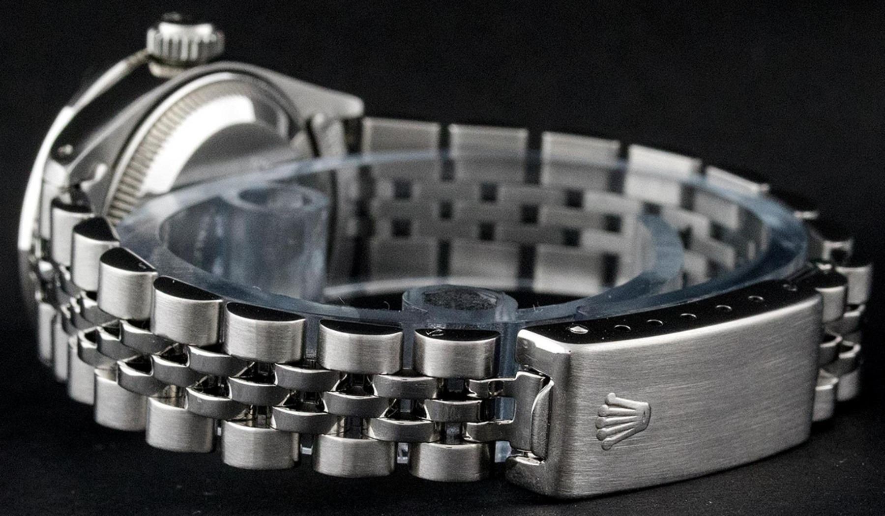 One Ladies Stainless Steel Rolex Datejust Polished Bright with Satin Finish, Serviced & Electronically Tested, Stainless Steel Case: 26mm, Stainless Steel Crown, Custom Bezel: New 18K White Gold Ruby Beadset Diamond Bezel, Diamond + Gem Count: 28 Diamonds + 4 Rubies. Total Weight .70 Carat, Clarity: SI-VS, Color: G to H. Custom Crystal: New Synthetic Scratch Resistant Sapphire Cyclops Lens. Custom Hands: New Luminescent Hands. Movement: Automatic Winding Movement Caliber 2030. Custom Dial: Refinished Purple With Diamond Hour Markers, Diamond Count: 10 Diamond in Dial, G To H In Color, Clarity: SI-VS. Date Window: 3 O'Clock Position Date Display, Model: Datejust. Condition: G-6 Extra Fine. Bracelet: Stainless Steel Jubilee. Bright Polish & Satin Finish. 6.0 Inch Length, Adjustable. Standard Clasp, With Rolex Logo. This Watch Has Been Serviced Time Tested And Is In Excellent Condition It Is Free Of All Scratches And Dents.