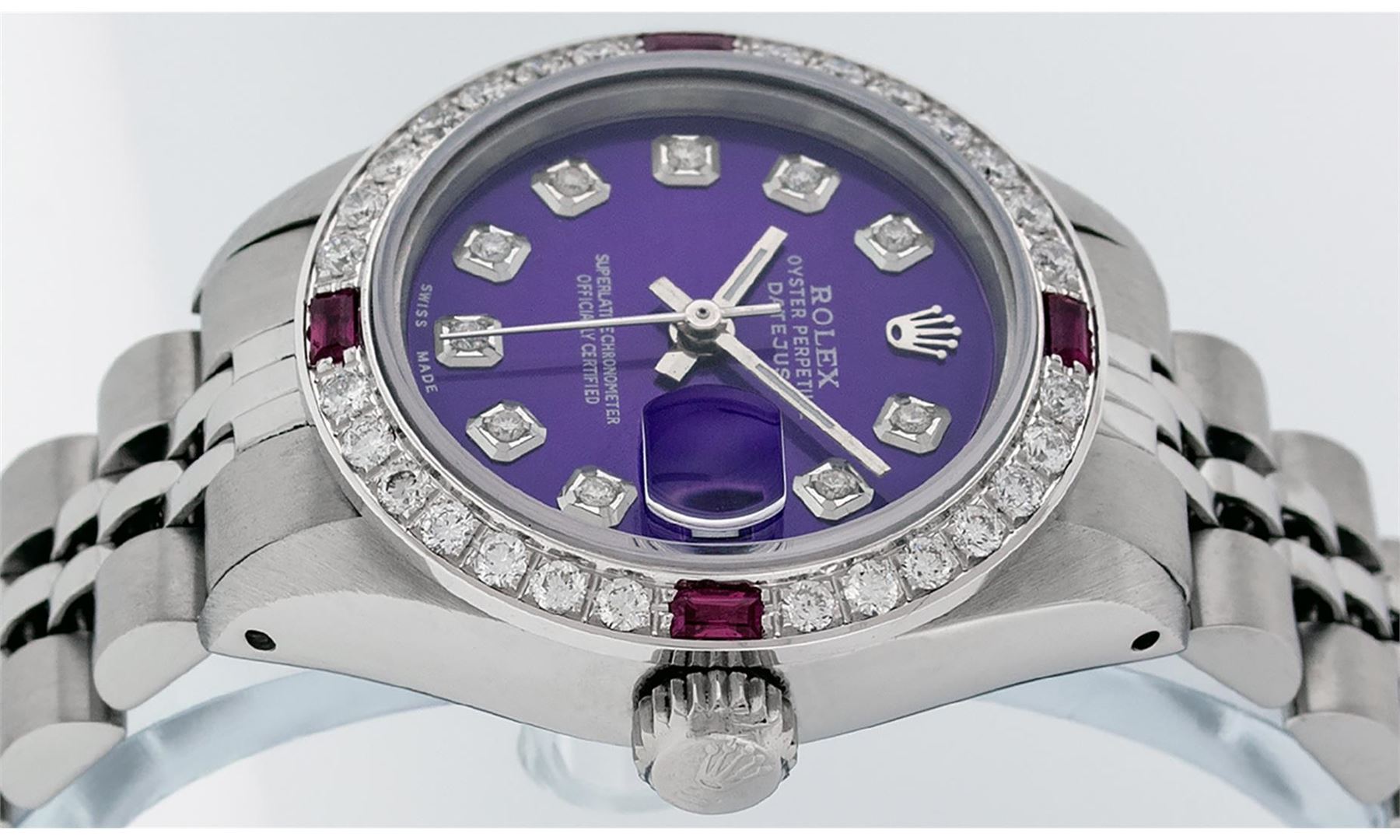 One Ladies Stainless Steel Rolex Datejust Polished Bright with Satin Finish, Serviced & Electronically Tested, Stainless Steel Case: 26mm, Stainless Steel Crown, Custom Bezel: New 18K White Gold Ruby Beadset Diamond Bezel, Diamond + Gem Count: 28 Diamonds + 4 Rubies. Total Weight .70 Carat, Clarity: SI-VS, Color: G to H. Custom Crystal: New Synthetic Sapphire Cyclops Lens. Custom Hands: New Luminescent Hands. Movement: Automatic Winding Movement Caliber 2030. Custom Dial: Refinished Purple With Diamond Hour Markers, Diamond Count: 10 Diamond in Dial, G To H In Color, Clarity: SI-VS. Date Window: 3 O'Clock Position Date Display, Model: Datejust. Condition: G-6 Extra Fine. Bracelet: Stainless Steel Jubilee. Bright Polish & Satin Finish. 6.0 Inch Length, Adjustable. Standard Clasp, With Rolex Logo. This Watch Has Been Serviced Time Tested And Is In Excellent Condition It Is Free Of All Scratches And Dents.