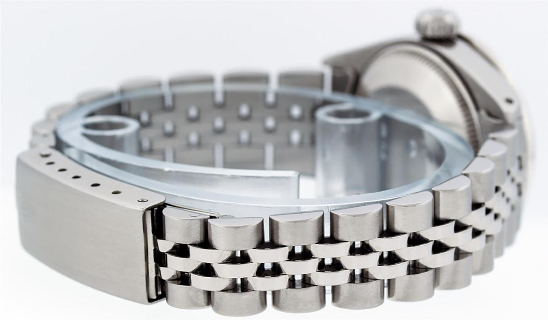 One Ladies Stainless Steel Rolex Datejust Polished Bright with Satin Finish, Serviced & Electronically Tested, Stainless Steel Case: 26mm, Stainless Steel Crown, Custom Bezel: New 18K White Gold Ruby Beadset Diamond Bezel, Diamond + Gem Count:� 28 Diamonds + 4 Rubies. Total Weight .70 Carat, Clarity: SI-VS, Color: G to H. Custom Crystal: New Synthetic Sapphire Cyclops Lens. Custom Hands: New Luminescent Hands. Movement: Automatic Winding Movement Caliber 2030. Custom Dial: Refinished Purple With Diamond Hour Markers, Diamond Count: 10 Diamond in Dial, G To H In Color, Clarity: SI-VS. Date Window: 3 O'Clock Position Date Display, Model: Datejust. Condition: G-6 Extra Fine. Bracelet: Stainless Steel Jubilee. Bright Polish & Satin Finish. 6.0 Inch Length, Adjustable. Standard Clasp, With Rolex Logo. This Watch Has Been Serviced Time Tested And Is In Excellent Condition It Is Free Of All Scratches And Dents.