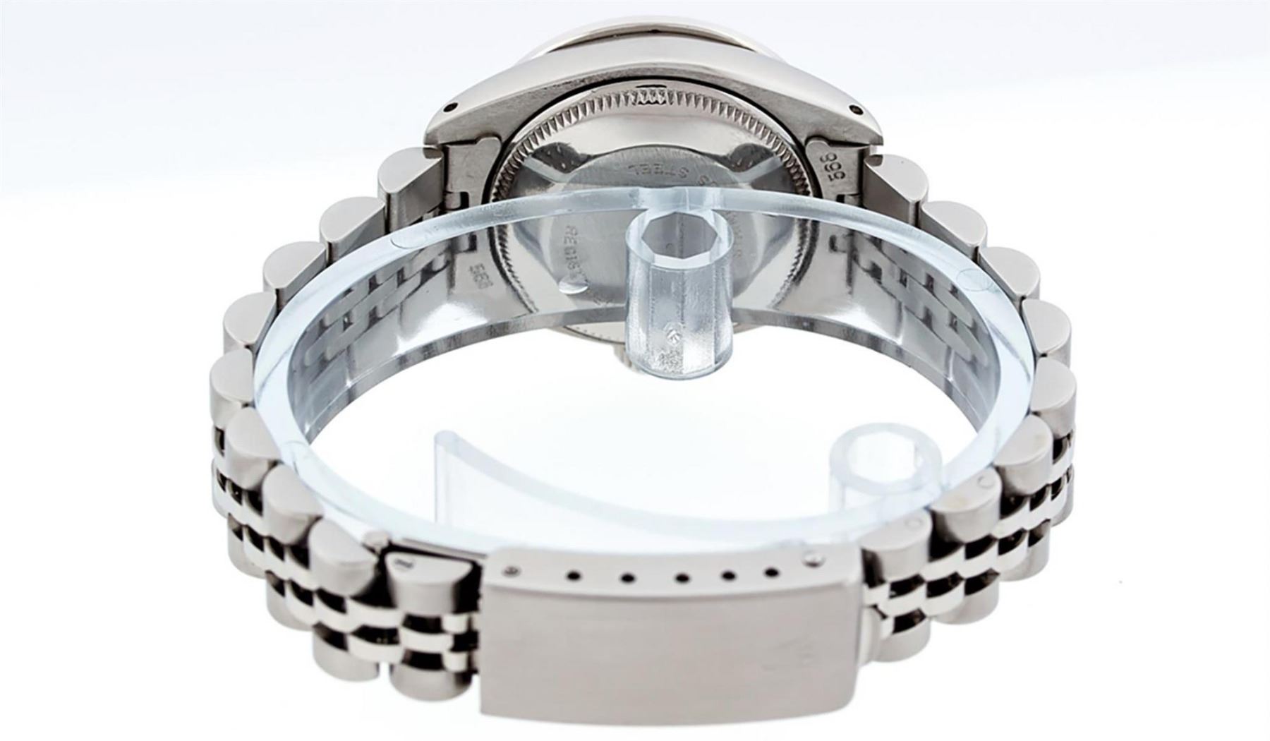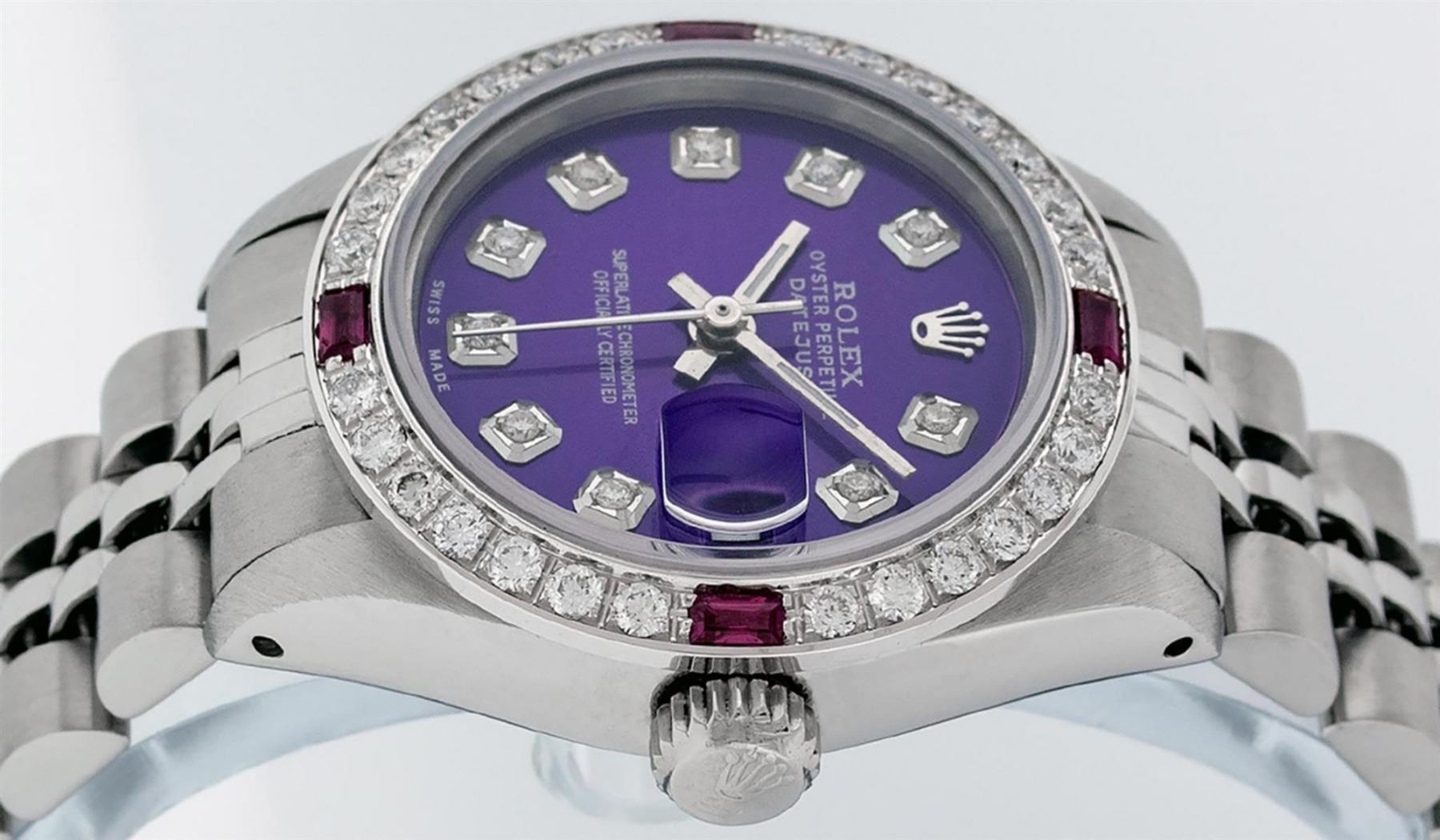 One Ladies Stainless Steel Rolex Datejust Polished Bright with Satin Finish, Serviced & Electronically Tested, Stainless Steel Case: 26mm, Stainless Steel Crown, Custom Bezel: New 18K White Gold Ruby Beadset Diamond Bezel, Diamond + Gem Count: 28 Diamonds + 4 Rubies. Total Weight .70 Carat, Clarity: SI-VS, Color: G to H. Custom Crystal: New Synthetic Sapphire Cyclops Lens. Custom Hands: New Luminescent Hands. Movement: Automatic Winding Movement Caliber 2030. Custom Dial: Refinished Purple With Diamond Hour Markers, Diamond Count: 10 Diamond in Dial, G To H In Color, Clarity: SI-VS. Date Window: 3 O'Clock Position Date Display, Model: Datejust. Condition: G-6 Extra Fine. Bracelet: Stainless Steel Jubilee. Bright Polish & Satin Finish. 6.0 Inch Length, Adjustable. Standard Clasp, With Rolex Logo. This Watch Has Been Serviced Time Tested And Is In Excellent Condition It Is Free Of All Scratches And Dents.