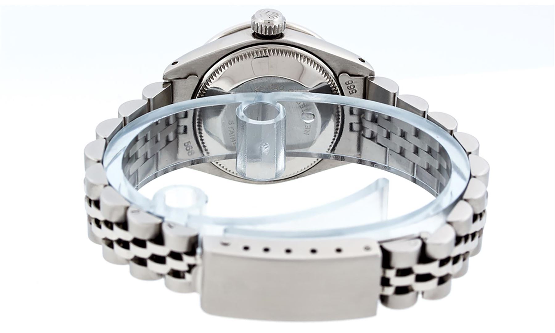 One Ladies Stainless Steel Rolex Datejust Polished Bright with Satin Finish, Serviced & Electronically Tested, Stainless Steel Case: 26mm, Stainless Steel Crown, Custom Bezel: New 18K White Gold Ruby Beadset Diamond Bezel, Diamond + Gem Count: 28 Diamonds + 4 Rubies. Total Weight .70 Carat, Clarity: SI-VS, Color: G to H. Custom Crystal: New Synthetic Sapphire Cyclops Lens. Custom Hands: New Luminescent Hands. Movement: Automatic Winding Movement. Custom Dial: Refinished Purple With Diamond Hour Markers, Diamond Count: 10 Diamond in Dial, G To H In Color, Clarity: SI-VS. Date Window: 3 O'Clock Position Date Display, Model: Datejust. Condition: G-6 Extra Fine. Bracelet: Stainless Steel Jubilee. Bright Polish & Satin Finish. 6.0 Inch Length, Adjustable. Standard Clasp, With Rolex Logo. This Watch Has Been Serviced Time Tested And Is In Excellent Condition It Is Free Of All Scratches And Dents.