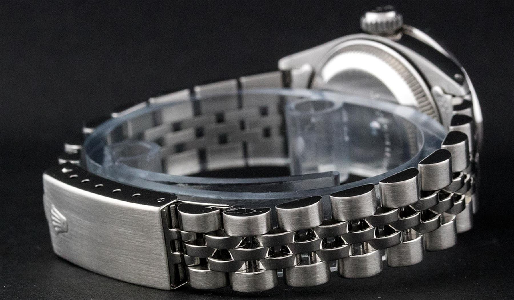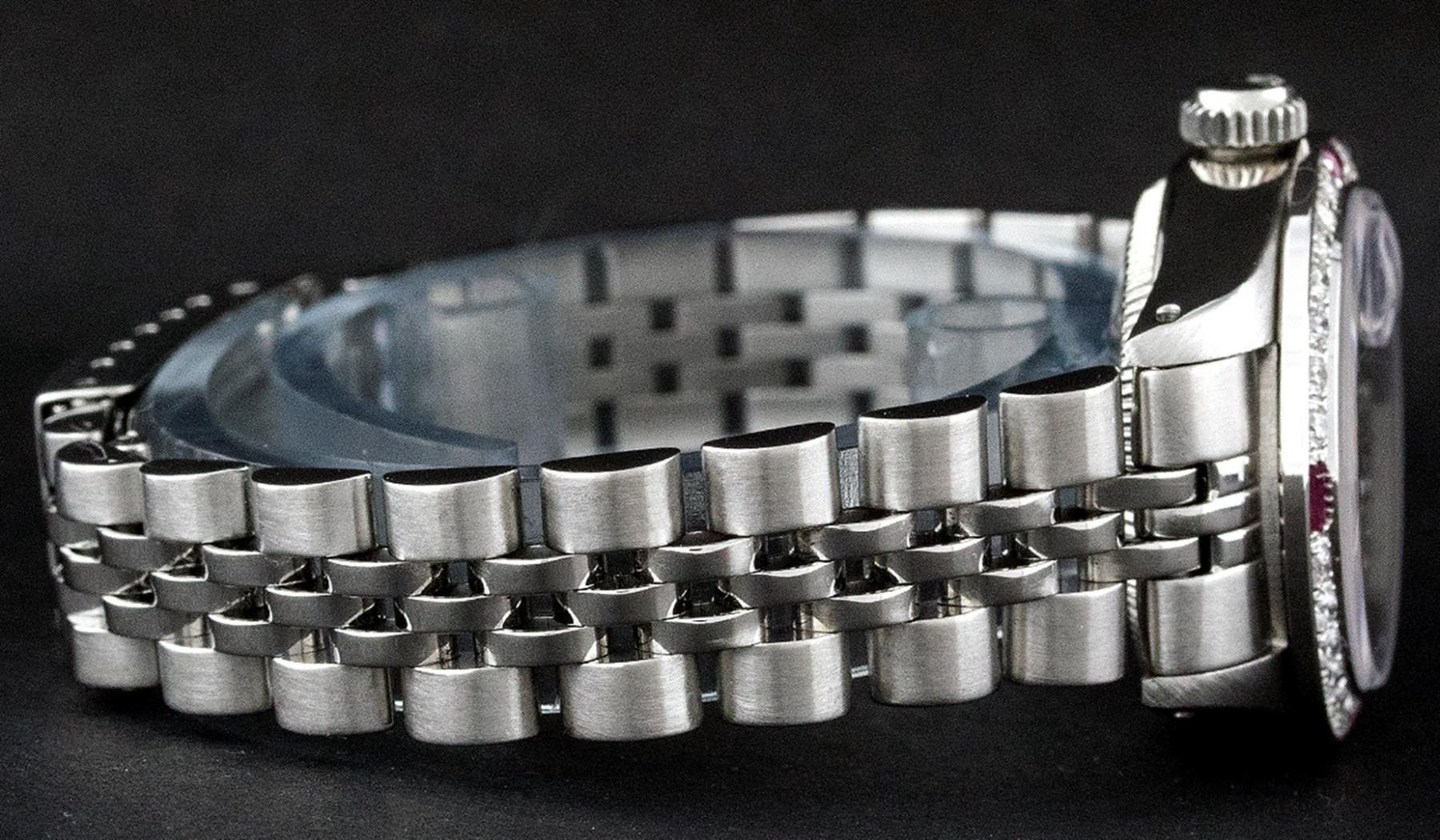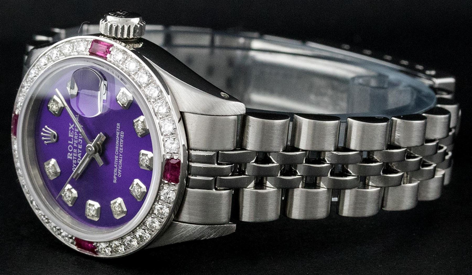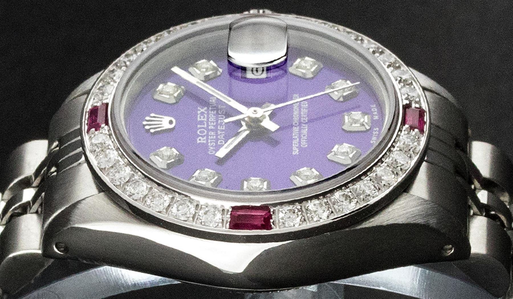 One Ladies Stainless Steel Rolex Datejust Polished Bright with Satin Finish, Serviced & Electronically Tested, Stainless Steel Case: 26mm, Stainless Steel Crown, Custom Bezel: New 18K White Gold Ruby Beadset Diamond Bezel, Diamond + Gem Count: 28 Diamonds + 4 Rubies. Total Weight .70 Carat, Clarity: SI-VS, Color: G to H. Custom Crystal: New Synthetic Sapphire Cyclops Lens. Custom Hands: New Luminescent Hands. Movement: Automatic Winding Movement. Custom Dial: Refinished Purple With Diamond Hour Markers, Diamond Count: 10 Diamond in Dial, G To H In Color, Clarity: SI-VS. Date Window: 3 O'Clock Position Date Display, Model: Datejust. Condition: G-6 Extra Fine. Bracelet: Stainless Steel Jubilee. Bright Polish & Satin Finish. 6.0 Inch Length, Adjustable. Standard Clasp, With Rolex Logo. This Watch Has Been Serviced Time Tested And Is In Excellent Condition It Is Free Of All Scratches And Dents.