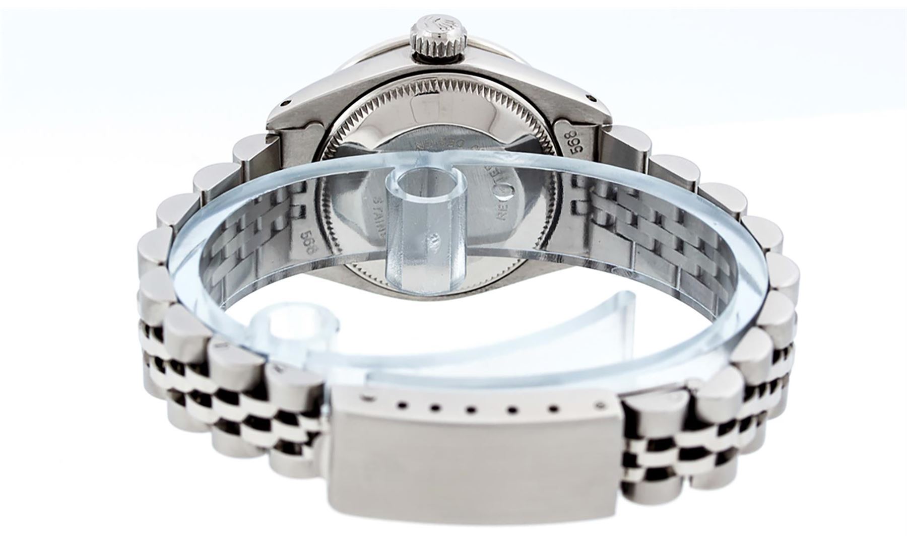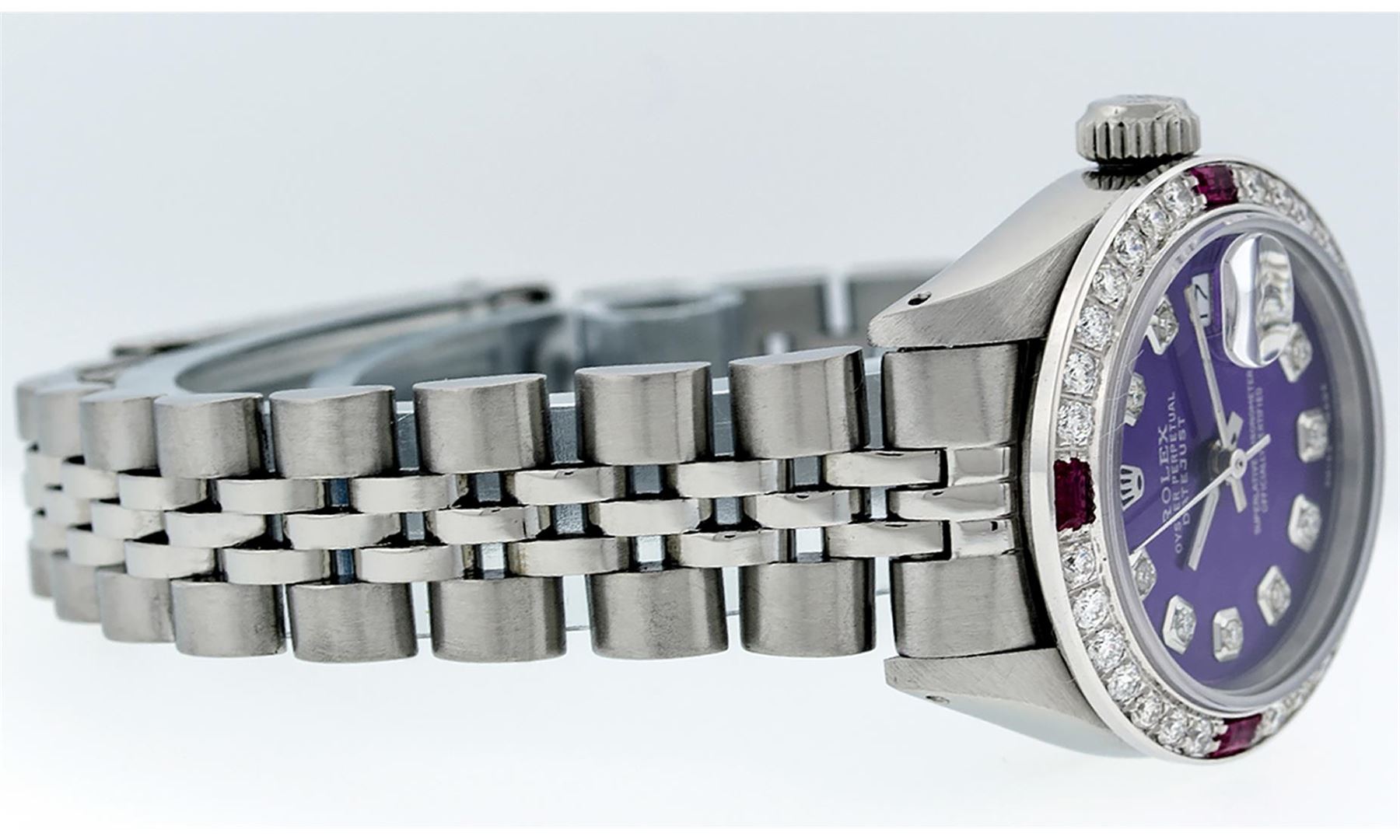 One Ladies Stainless Steel Rolex Datejust Polished Bright with Satin Finish, Serviced & Electronically Tested, Stainless Steel Case: 26mm, Stainless Steel Crown, Custom Bezel: New 18K White Gold Ruby Beadset Diamond Bezel, Diamond + Gem Count: 28 Diamonds + 4 Rubies. Total Weight .70 Carat, Clarity: SI-VS, Color: G to H. Custom Crystal: New Synthetic Sapphire Cyclops Lens. Custom Hands: New Luminescent Hands. Movement: Automatic Winding Movement. Custom Dial: Refinished Purple With Diamond Hour Markers, Diamond Count: 10 Diamond in Dial, G To H In Color, Clarity: SI-VS. Date Window: 3 O'clock Position Date Display, Model: Datejust. Condition: G-6 Extra Fine. Bracelet: Stainless Steel Jubilee. Bright Polish & Satin Finish. 6.0 Inch Length, Adjustable. Standard Clasp, With Rolex Logo. This Watch Has Been Serviced Time Tested And Is In Excellent Condition It Is Free Of All Scratches And Dents.