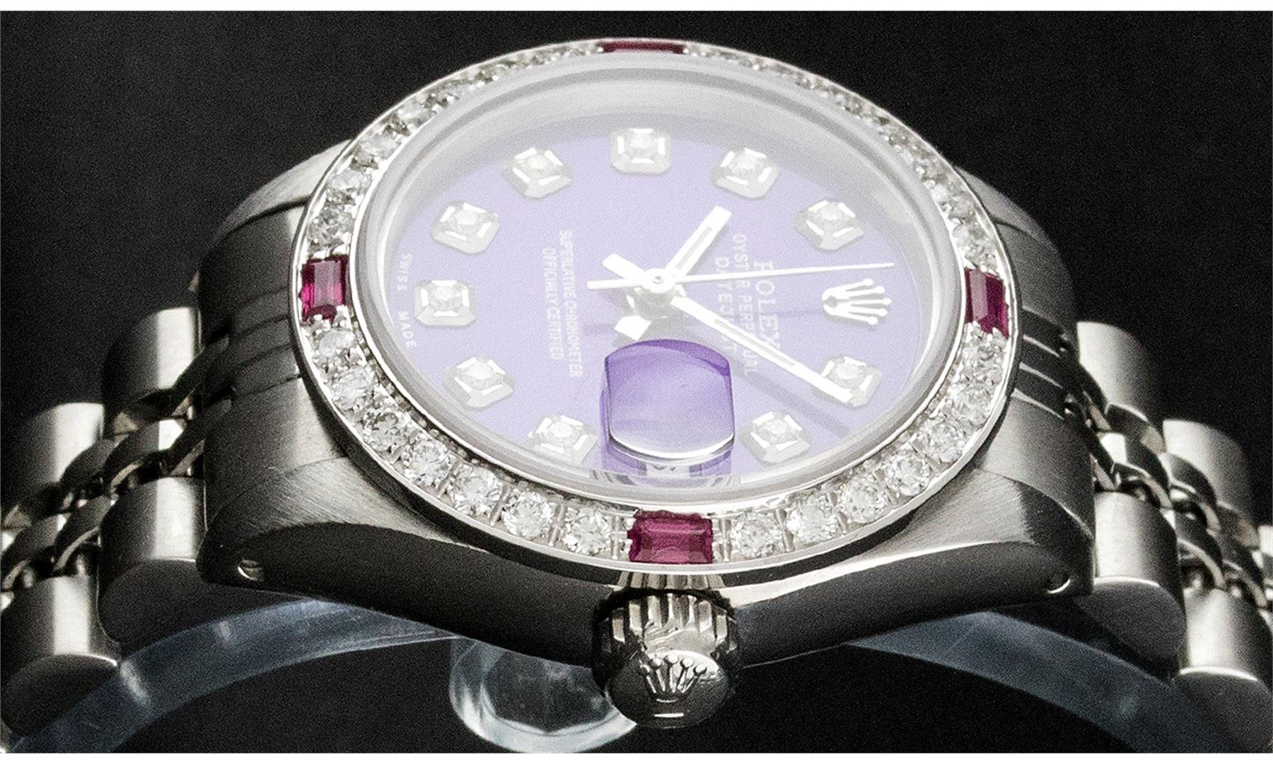 One Ladies Stainless Steel Rolex Datejust Polished Bright with Satin Finish, Serviced & Electronically Tested, Stainless Steel Case: 26mm, Stainless Steel Crown, Custom Bezel: New 18K White Gold Ruby Beadset Diamond Bezel, Diamond + Gem Count: 28 Diamonds + 4 Rubies. Total Weight .70 Carat, Clarity: SI-VS, Color: G to H. Custom Crystal: New Synthetic Sapphire Cyclops Lens. Custom Hands: New Luminescent Hands. Movement: Automatic Winding Movement. Custom Dial: Refinished Purple With Diamond Hour Markers, Diamond Count: 10 Diamond in Dial, G To H In Color, Clarity: SI-VS. Date Window: 3 O'Clock Position Date Display, Model: Datejust. Condition: G-6 Extra Fine. Bracelet: Stainless Steel Jubilee. Bright Polish & Satin Finish. 6.0 Inch Length, Adjustable. Standard Clasp, With Rolex Logo. This Watch Has Been Serviced Time Tested And Is In Excellent Condition It Is Free Of All Scratches And Dents.