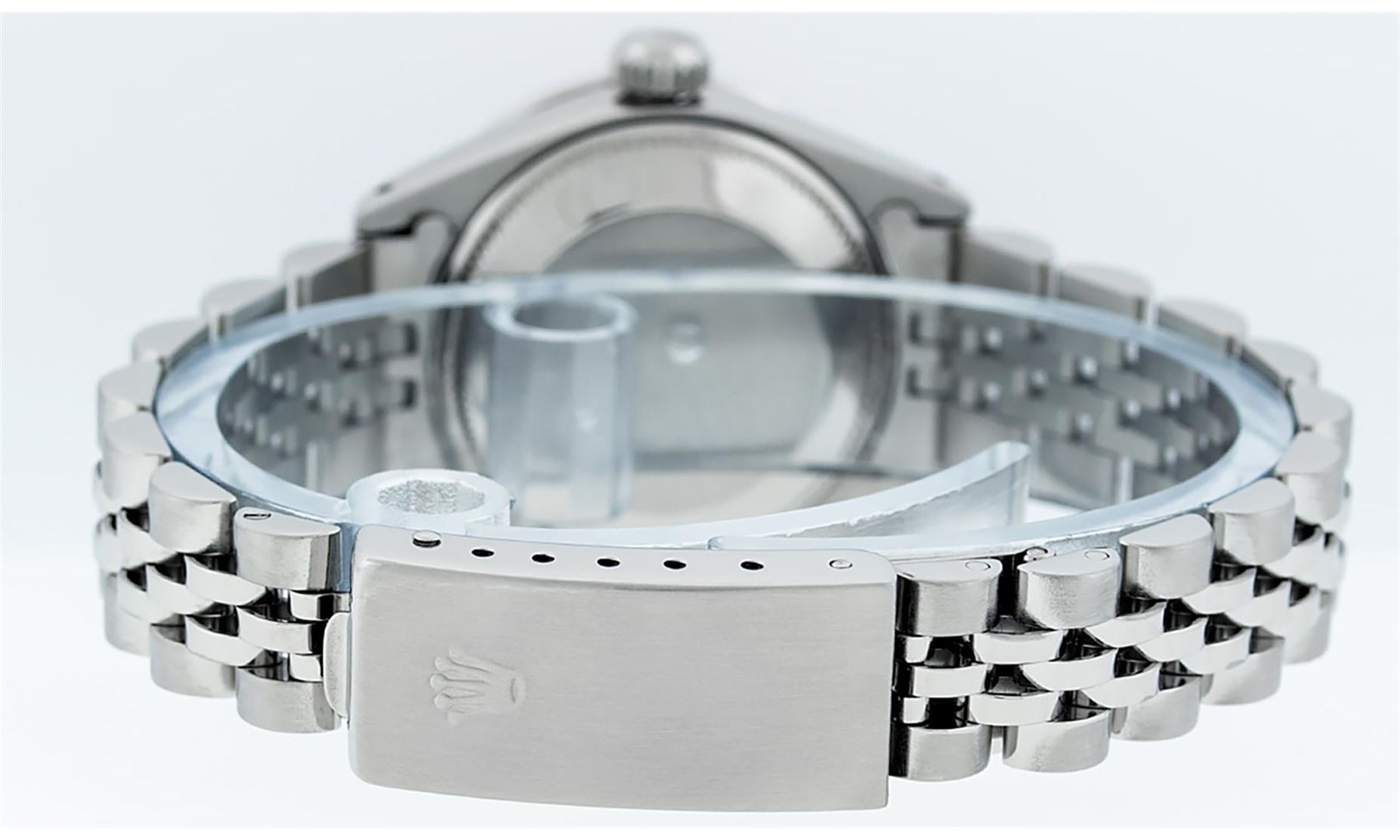 One Ladies Stainless Steel Rolex Datejust Polished Bright with Satin Finish, Serviced & Electronically Tested, Stainless Steel Case: 26mm, Stainless Steel Crown, Custom Bezel: New 18K White Ruby Beadset Diamond Bezel, Diamond + Gem Count: 28 Diamonds + 4 Rubies. Total Weight .70 Carat, Clarity: SI-VS, Color: G to H. Custom Crystal: New Scratch Resistant Synthetic Sapphire Cyclops Lens. Custom Hands: New Luminescent Hands. Movement: Automatic Winding Movement. Custom Dial: Purple Stamp With Single Cut Diamond Hour Markers, 10 Diamonds in Dial, G To H In Color, Clarity: SI-VS. Date Window: 3 O'Clock Position Date Display, Model: Datejust. Condition: G-6 Extra Fine. Bracelet: Stainless Steel Jubilee Band. Bright Polish & Satin Finish. 6.0 Inch Length, Adjustable. Standard Clasp, With Rolex Logo. This Watch Has Been Serviced Time Tested And Is In Excellent Condition It Is Free Of All Scratches And Dents.