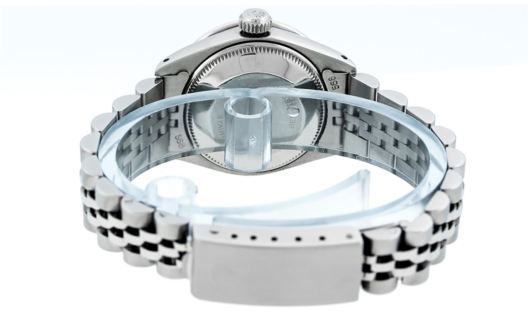 One Ladies Stainless Steel Rolex Datejust Polished Bright with Satin Finish, Serviced & Electronically Tested, Stainless Steel Case: 26mm, Stainless Steel Crown, Custom Bezel: New 18K White Ruby Beadset Diamond Bezel, Diamond + Gem Count: 28 Diamonds + 4 Rubies. Total Weight .70 Carat, Clarity: SI-VS, Color: G to H. Custom Crystal: New Scratch Resistant Synthetic Sapphire Cyclops Lens. Custom Hands: New Luminescent Hands. Movement: Automatic Winding Movement. Custom Dial: Purple Stamp With Single Cut Diamond Hour Markers, 10 Diamonds in Dial, G To H In Color, Clarity: SI-VS. Date Window: 3 O'Clock Position Date Display, Model: Datejust. Condition: G-6 Extra Fine. Bracelet: Stainless Steel Jubilee Band. Bright Polish & Satin Finish. 6.0 Inch Length, Adjustable. Standard Clasp, With Rolex Logo. This Watch Has Been Serviced Time Tested And Is In Excellent Condition It Is Free Of All Scratches And Dents.