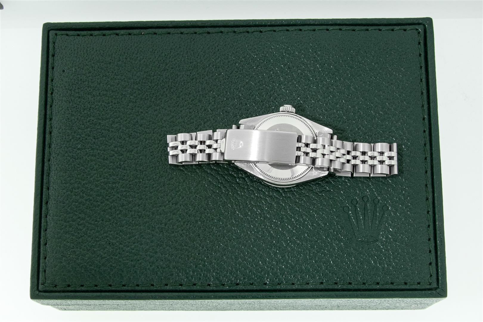 One Ladies Stainless Steel Rolex Datejust Polished Bright with Satin Finish, Serviced & Electronically Tested, Rolex Stainless Steel Case: 26mm, Rolex Stainless Steel Crown, Custom Diamond Lugs: 24 Diamonds On Lugs, Clarity: SI-VS, Color: G to H. Custom Bezel: New 18K White Gold Diamond + Ruby Beadset Diamond Bezel, Stone Count: 28 Diamonds + 4 Rubies, Total Weight .70 Carat, Clarity: SI-VS, Color: G to H. Custom Crystal: New Sapphire With Magnified Date Window. Custom Hands: New Luminescent Hands. Rolex Movement: Automatic Winding Movement. Custom Dial: Refinished To Purple With Custom Added Diamonds, 43 Diamonds in Dial G To H In Color, Clarity: VS. Date Window: 3 O'clock Position Date Display, Model: Datejust. Condition: G-6 Extra Fine. Rolex Bracelet: Stainless Steel Jubilee Band. Bright Polish & Satin Finish. 6.0 Inch Length, Adjustable. Standard Clasp, With Rolex Logo. This Pre Owned Watch Has Been Serviced Time Tested And Is In Excellent Condition It Is Free Of All Scratches And Dents. This Watch Comes With A Rolex Box.