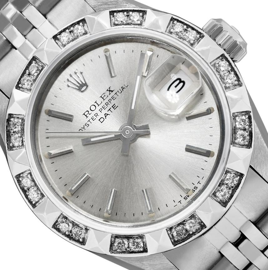 This Lady Rolex Date watch features a silver dial with index hour markers and a custom sapphire crystal, with a magnified date window. The timepiece has custom 18K white gold pyramid diamond bezel, set with genuine round diamonds (Please note that this diamond bezel is an aftermarket modification and was not manufactured by Rolex). The Rolex 26mm case is crafted from stainless steel and includes a Rolex screw-down crown. The bracelet is a Rolex stainless steel Jubilee band, designed to fit wrists up to 6 inches in circumference. The Watch Is Powered by the Rolex automatic self-winding Caliber 2035 movement. This watch has been polished and serviced and is in excellent condition. It will also be time tested before shipment.