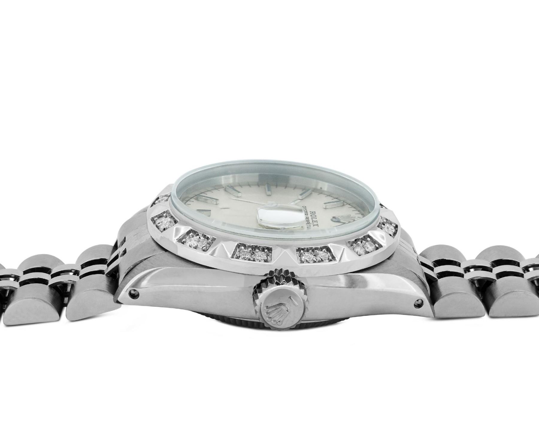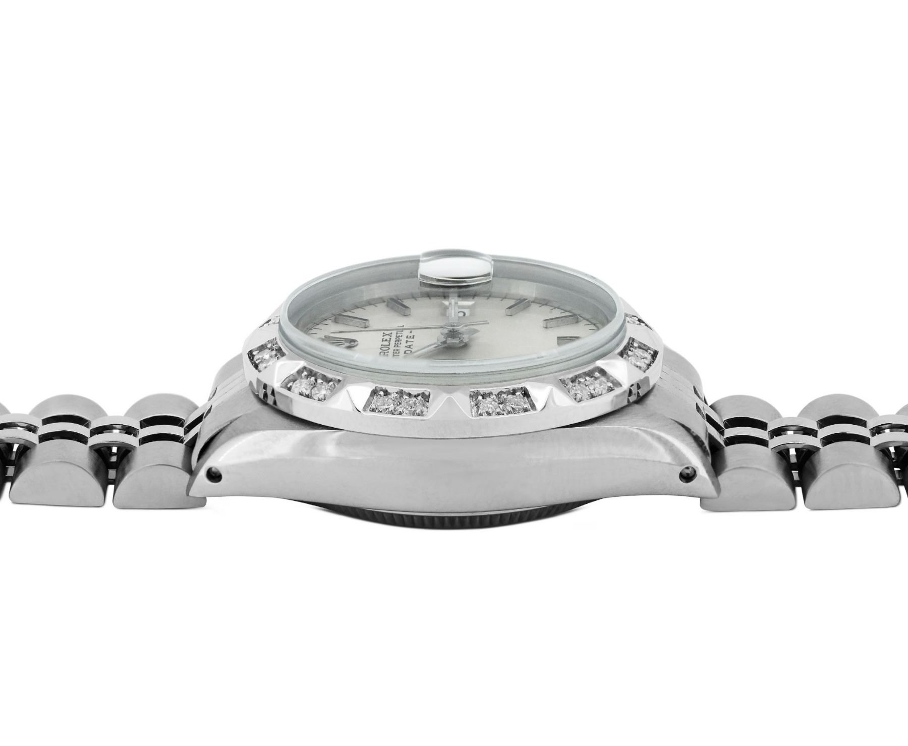 This Lady Rolex Date watch features a silver dial with index hour markers and a custom sapphire crystal, with a magnified date window. The timepiece has custom 18K white gold pyramid diamond bezel, set with genuine round diamonds (Please note that this diamond bezel is an aftermarket modification and was not manufactured by Rolex). The Rolex 26mm case is crafted from stainless steel and includes a Rolex screw-down crown. The bracelet is a Rolex stainless steel Jubilee band, designed to fit wrists up to 6 inches in circumference. The Watch Is Powered by the Rolex automatic self-winding Caliber 2035 movement. This watch has been polished and serviced and is in excellent condition. It will also be time tested before shipment.