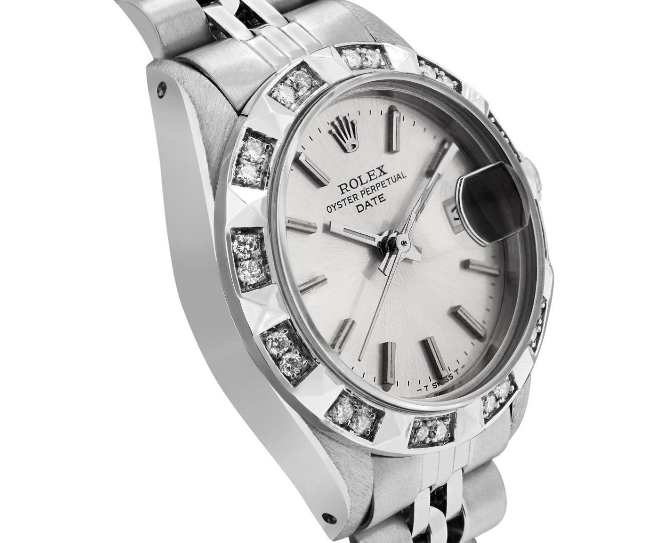 This Lady Rolex Date watch features a silver dial with index hour markers and a custom sapphire crystal, with a magnified date window. The timepiece has custom 18K white gold pyramid diamond bezel, set with genuine round diamonds (Please note that this diamond bezel is an aftermarket modification and was not manufactured by Rolex). The Rolex 26mm case is crafted from stainless steel and includes a Rolex screw-down crown. The bracelet is a Rolex stainless steel Jubilee band, designed to fit wrists up to 6 inches in circumference. The Watch Is Powered by the Rolex automatic self-winding Caliber 2035 movement. This watch has been polished and serviced and is in excellent condition. It will also be time tested before shipment.