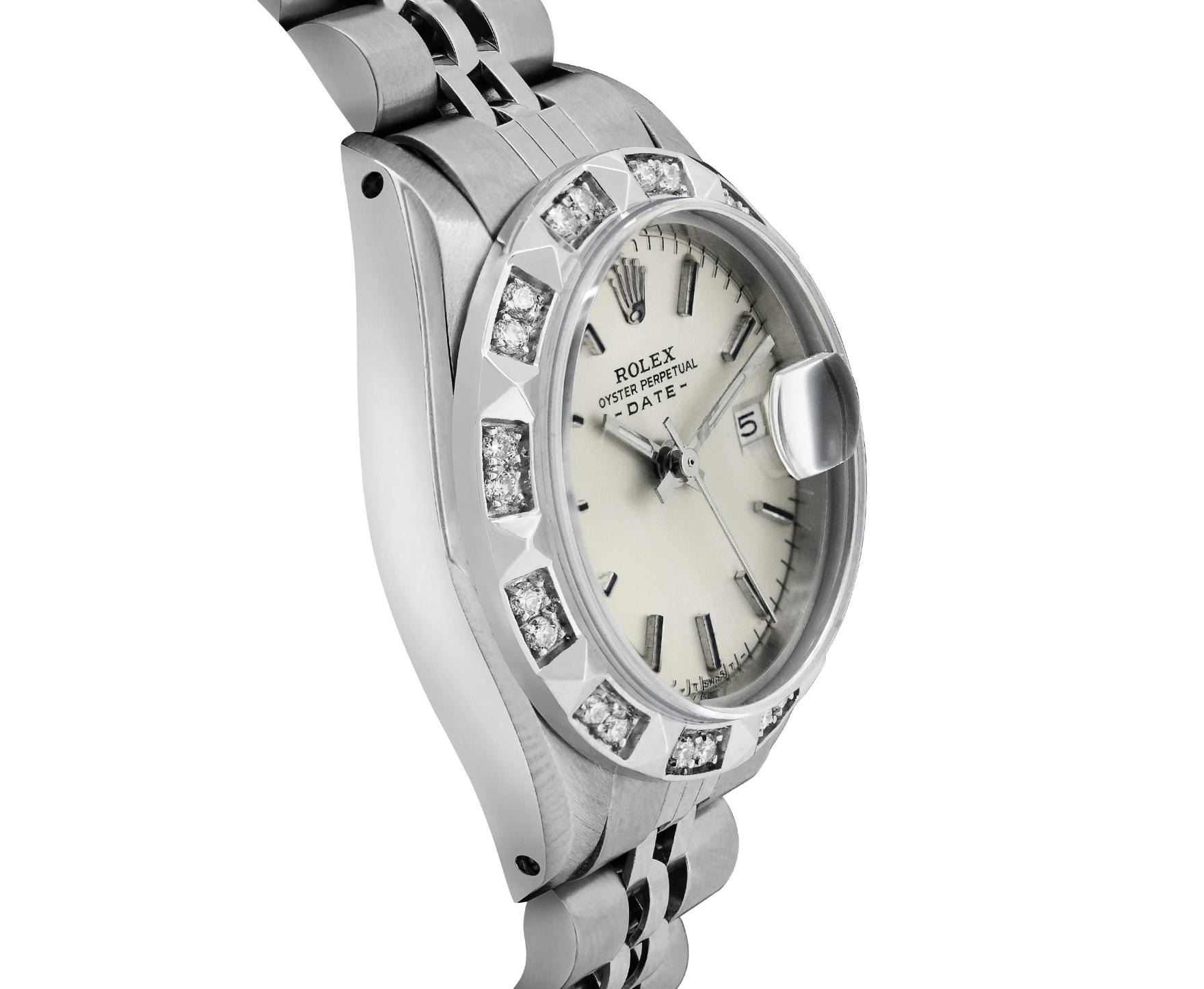 This Lady Rolex Date watch features a silver dial with index hour markers and a custom sapphire crystal, with a magnified date window. The timepiece has custom 18K white gold pyramid diamond bezel, set with genuine round diamonds (Please note that this diamond bezel is an aftermarket modification and was not manufactured by Rolex). The Rolex 26mm case is crafted from stainless steel and includes a Rolex screw-down crown. The bracelet is a Rolex stainless steel Jubilee band, designed to fit wrists up to 6 inches in circumference. The Watch Is Powered by the Rolex automatic self-winding Caliber 2035 movement. This watch has been polished and serviced and is in excellent condition. It will also be time tested before shipment.
