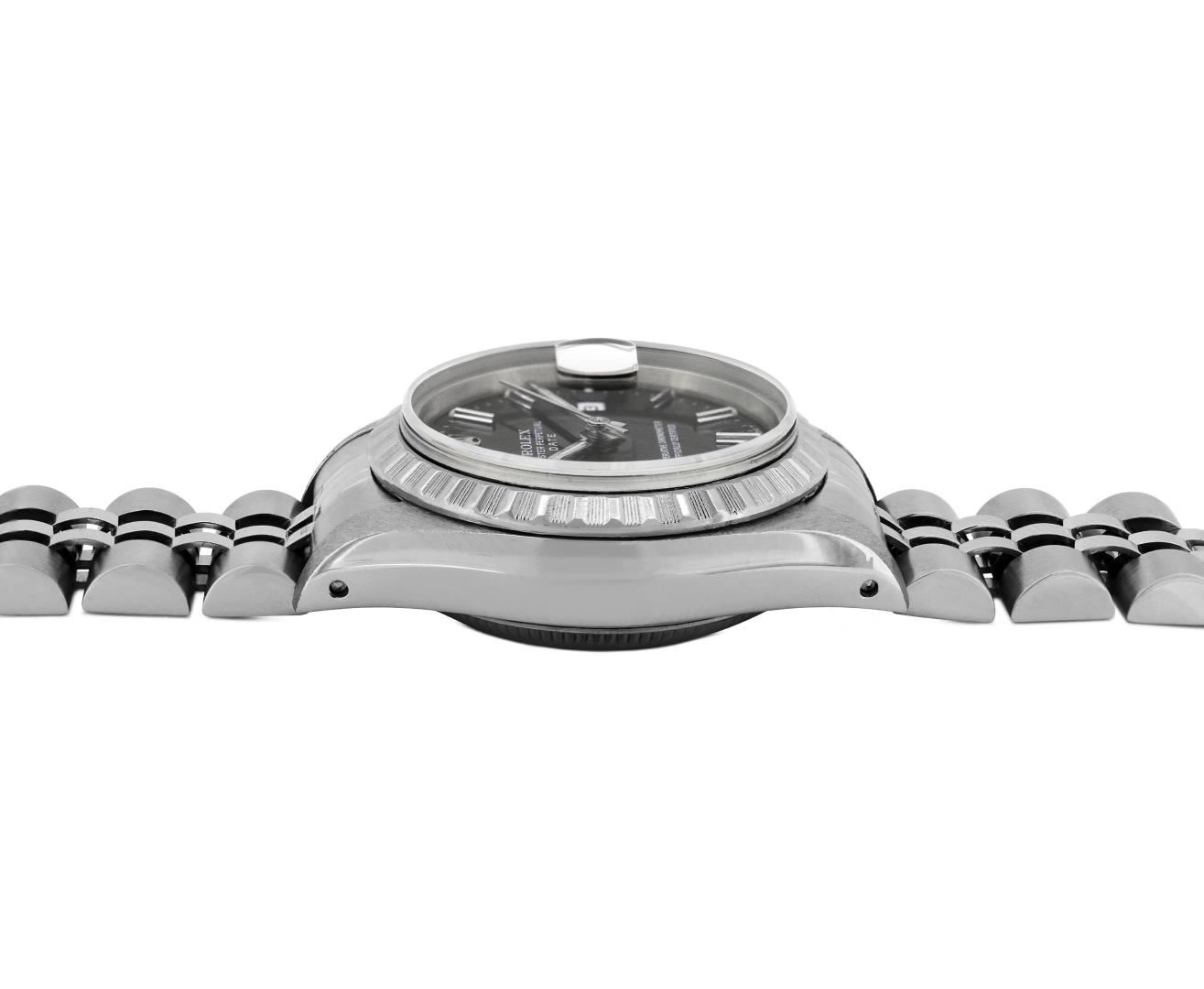 One Rolex Ladies Pre Owned Stainless Steel Date Wristwatch Polished Bright with Satin Finish, Serviced & Electronically Tested, Stainless Steel Case: 26mm, Stainless Steel Crown, Rolex Stainless Steel Engine Turn bezel. Custom Crystal: New Sapphire With Magnified Date Window. Custom Hands: New Luminescent Hands. Rolex Movement: 2135 Automatic Winding Movement. Rolex Dial: Factory Black With Index Hour Markers And Lumi Dots. Date Window: 3 O'Clock Position Date Display, Model: Quickset Date. Condition: G-6 Extra Fine. Rolex Bracelet: Stainless Steel Jubilee Band. Bright Polish & Satin Finish. 6.0 Inch Length, Adjustable. Standard Clasp, With Rolex Logo. This Watch Has Been Serviced And Time Tested. It Is In Excellent Condition, Free Of All Scratches And Dents. This Watch Comes With A Rolex Box.