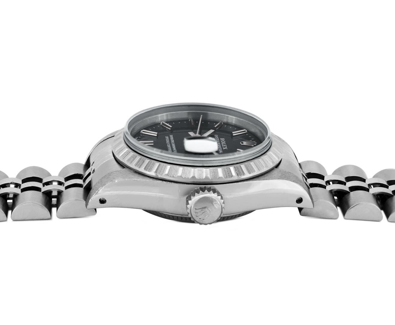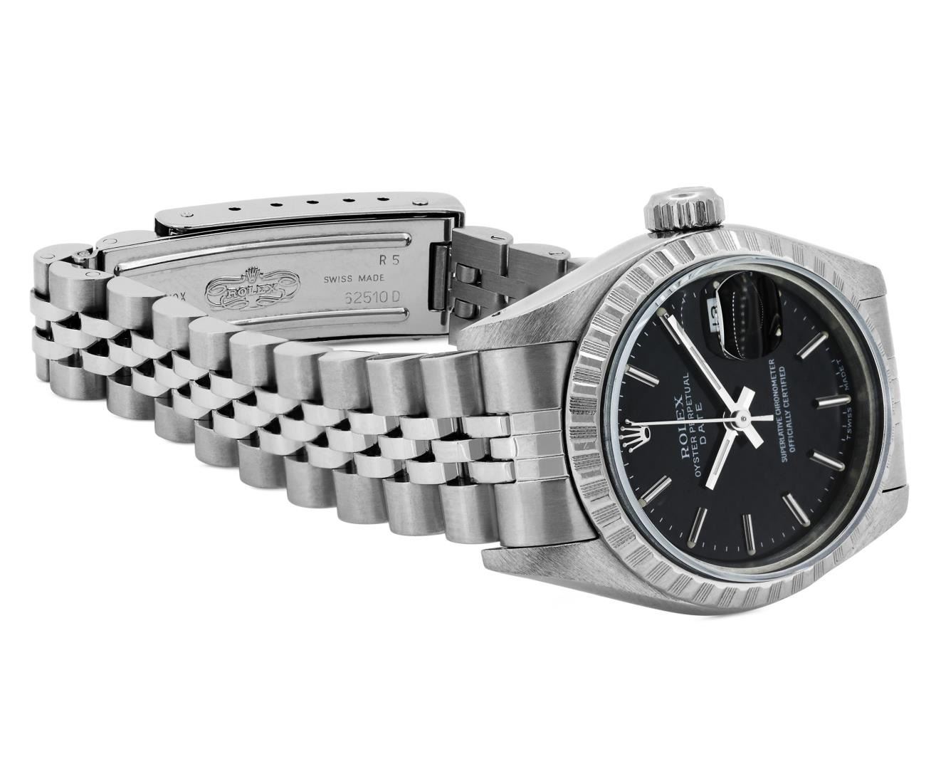 One Rolex Ladies Pre Owned Stainless Steel Date Wristwatch Polished Bright with Satin Finish, Serviced & Electronically Tested, Stainless Steel Case: 26mm, Stainless Steel Crown, Rolex Stainless Steel Engine Turn bezel. Custom Crystal: New Sapphire With Magnified Date Window. Custom Hands: New Luminescent Hands. Rolex Movement: 2135 Automatic Winding Movement. Rolex Dial: Factory Black With Index Hour Markers And Lumi Dots. Date Window: 3 O'Clock Position Date Display, Model: Quickset Date. Condition: G-6 Extra Fine. Rolex Bracelet: Stainless Steel Jubilee Band. Bright Polish & Satin Finish. 6.0 Inch Length, Adjustable. Standard Clasp, With Rolex Logo. This Watch Has Been Serviced And Time Tested. It Is In Excellent Condition, Free Of All Scratches And Dents. This Watch Comes With A Rolex Box.