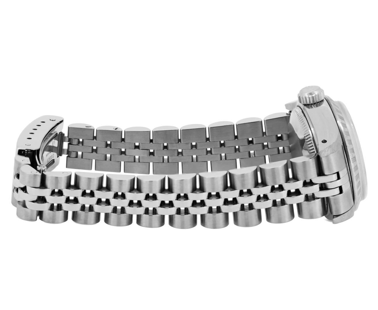 One Rolex Ladies Pre Owned Stainless Steel Date Wristwatch Polished Bright with Satin Finish, Serviced & Electronically Tested, Stainless Steel Case: 26mm, Stainless Steel Crown, Rolex Stainless Steel Engine Turn bezel. Custom Crystal: New Sapphire With Magnified Date Window. Custom Hands: New Luminescent Hands. Rolex Movement: 2135 Automatic Winding Movement. Rolex Dial: Factory Black With Index Hour Markers And Lumi Dots. Date Window: 3 O'Clock Position Date Display, Model: Quickset Date. Condition: G-6 Extra Fine. Rolex Bracelet: Stainless Steel Jubilee Band. Bright Polish & Satin Finish. 6.0 Inch Length, Adjustable. Standard Clasp, With Rolex Logo. This Watch Has Been Serviced And Time Tested. It Is In Excellent Condition, Free Of All Scratches And Dents. This Watch Comes With A Rolex Box.