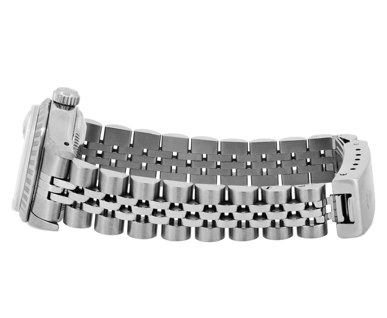 One Rolex Ladies Pre Owned Stainless Steel Date Wristwatch Polished Bright with Satin Finish, Serviced & Electronically Tested, Stainless Steel Case: 26mm, Stainless Steel Crown, Rolex Stainless Steel Engine Turn bezel. Custom Crystal: New Sapphire With Magnified Date Window. Custom Hands: New Luminescent Hands. Rolex Movement: 2135 Automatic Winding Movement. Rolex Dial: Factory Black With Index Hour Markers And Lumi Dots. Date Window: 3 O'Clock Position Date Display, Model: Quickset Date. Condition: G-6 Extra Fine. Rolex Bracelet: Stainless Steel Jubilee Band. Bright Polish & Satin Finish. 6.0 Inch Length, Adjustable. Standard Clasp, With Rolex Logo. This Watch Has Been Serviced And Time Tested. It Is In Excellent Condition, Free Of All Scratches And Dents. This Watch Comes With A Rolex Box.