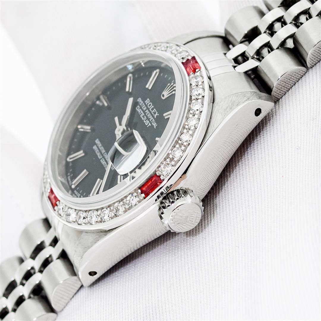 One Ladies Pre Owned Quickset Stainless Steel Rolex Datejust Polished Bright with Satin Finish Serviced & Electronically Tested, Rolex Stainless Steel Case: 26mm, Rolex Stainless Steel Crown, Custom Bezel: New 18K White Gold Beadset Diamond And Ruby Bezel, Diamond Count: 28 Diamonds + 4 Rubies, Color: G to H, Clarity: SI-VS, Custom Crystal: New Sapphire With Magnified Date Window. Custom Hands: New Luminescent Hands. Rolex Movement: Automatic Winding Movement. Rolex Dial: Black Index Dial With Dash Track And Lumi Dots. Date Window: 3 O'Clock Position Date Display, Model: Quickset Datejust. Condition: G-6 Extra Fine. Rolex Bracelet: Stainless Steel Jubilee Band With Rolex Crown On Buckle. Bright Polish & Satin Finish. Band Length: 6.0 Inch Length, Adjustable. Standard Clasp, With Rolex Logo. This Watch Has Been Serviced Time Tested And Is In Excellent Condition It Is Free Of All Scratches And Dents.