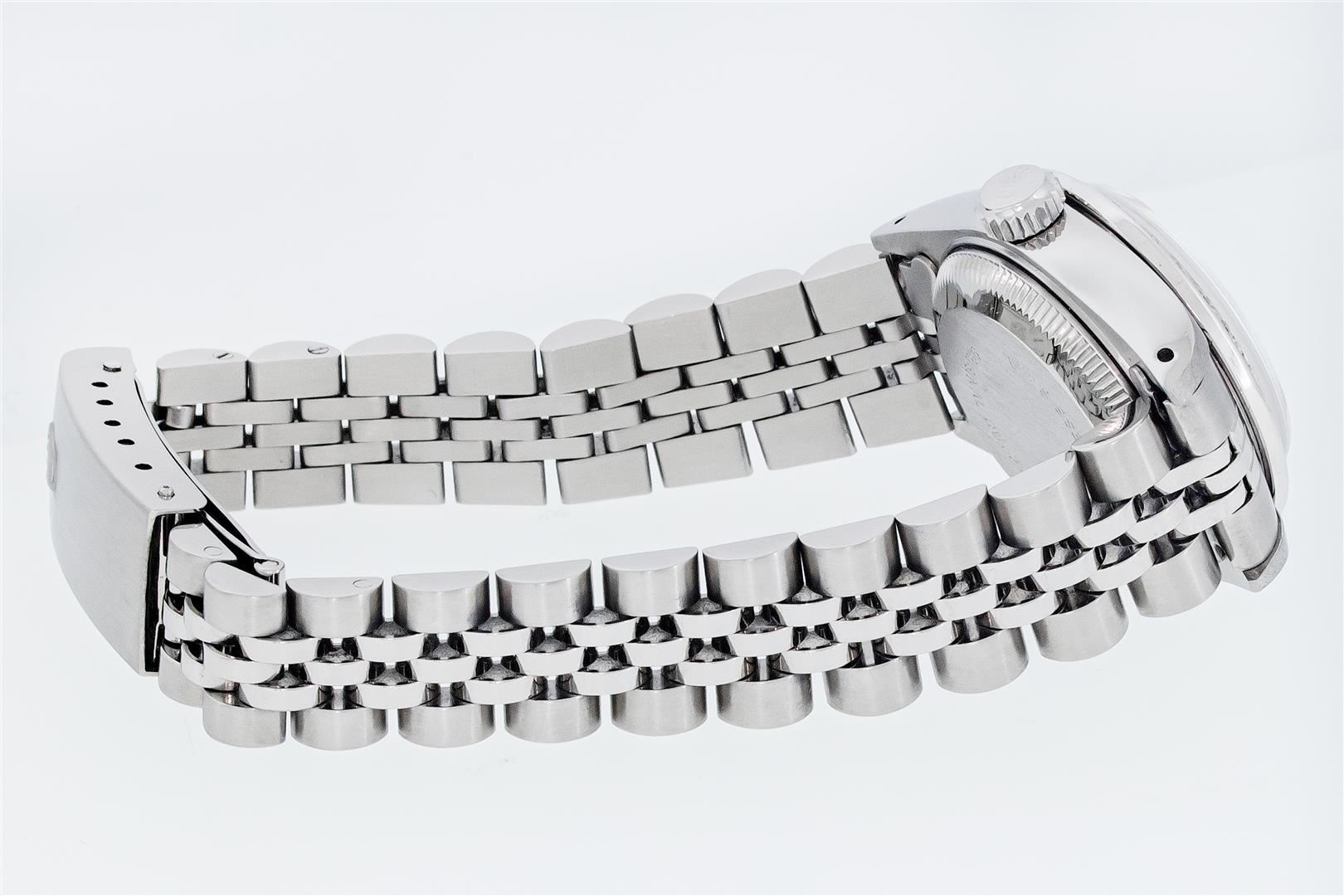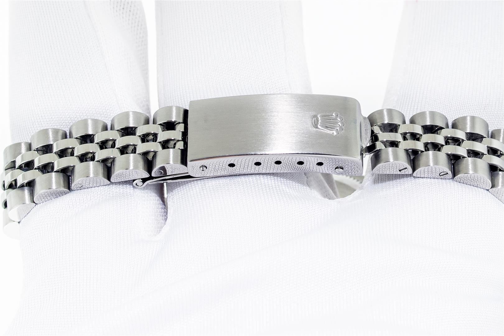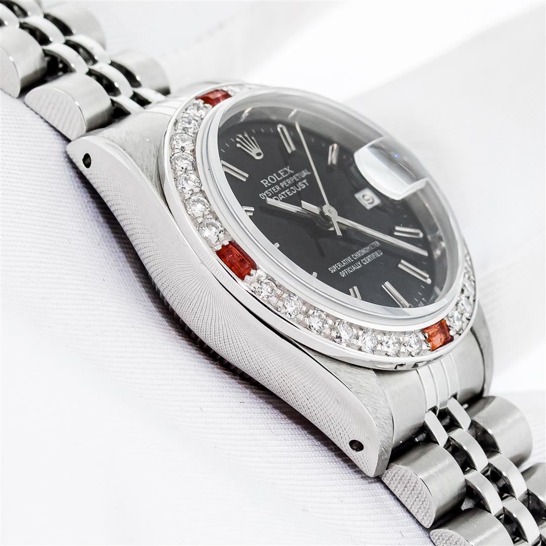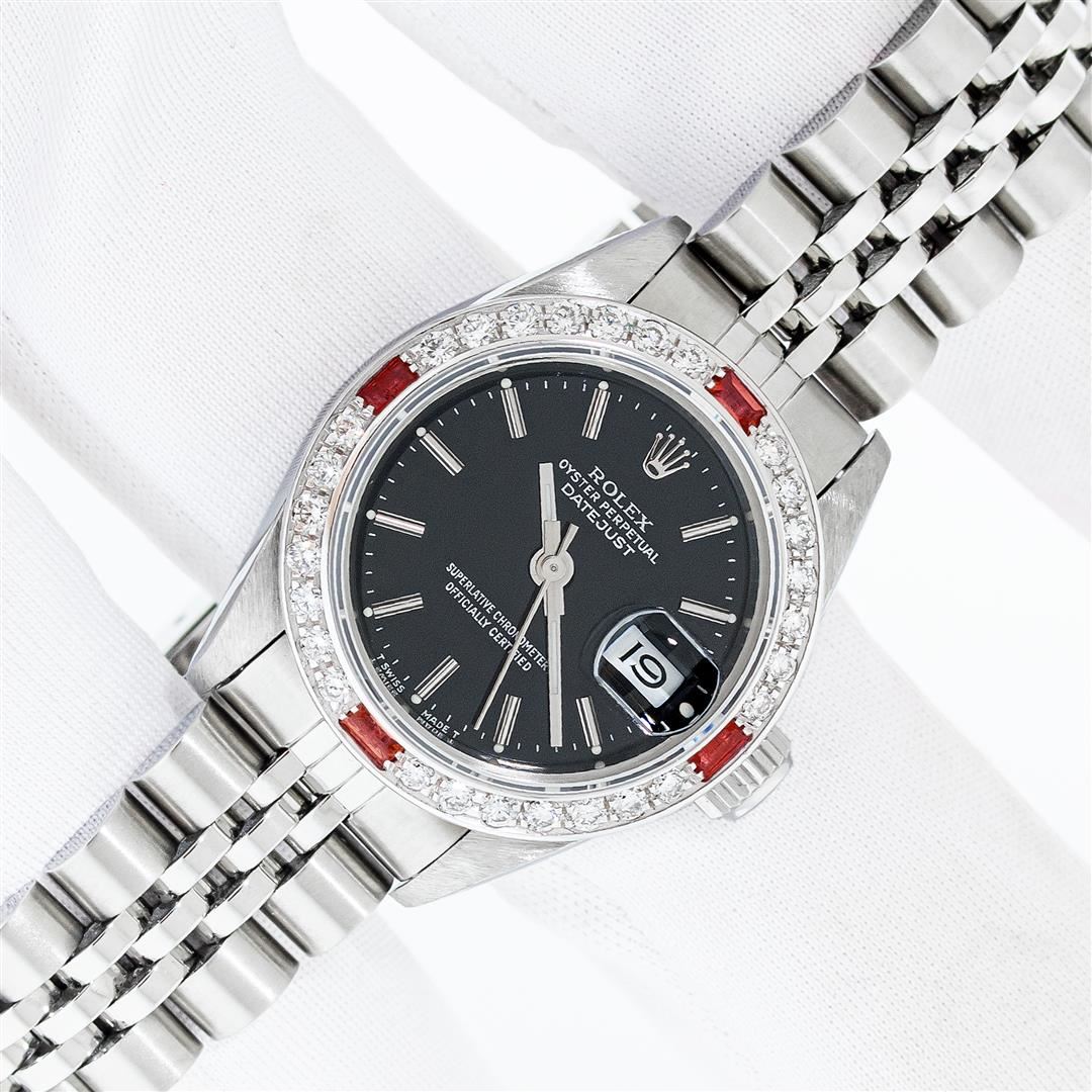 One Ladies Pre Owned Quickset Stainless Steel Rolex Datejust Polished Bright with Satin Finish Serviced & Electronically Tested, Rolex Stainless Steel Case: 26mm, Rolex Stainless Steel Crown, Custom Bezel: New 18K White Gold Beadset Diamond And Ruby Bezel, Diamond Count: 28 Diamonds + 4 Rubies, Color: G to H, Clarity: SI-VS, Custom Crystal: New Sapphire With Magnified Date Window. Custom Hands: New Luminescent Hands. Rolex Movement: Automatic Winding Movement. Rolex Dial: Black Index Dial With Dash Track And Lumi Dots. Date Window: 3 O'Clock Position Date Display, Model: Quickset Datejust. Condition: G-6 Extra Fine. Rolex Bracelet: Stainless Steel Jubilee Band With Rolex Crown On Buckle. Bright Polish & Satin Finish. Band Length: 6.0 Inch Length, Adjustable. Standard Clasp, With Rolex Logo. This Watch Has Been Serviced Time Tested And Is In Excellent Condition It Is Free Of All Scratches And Dents.