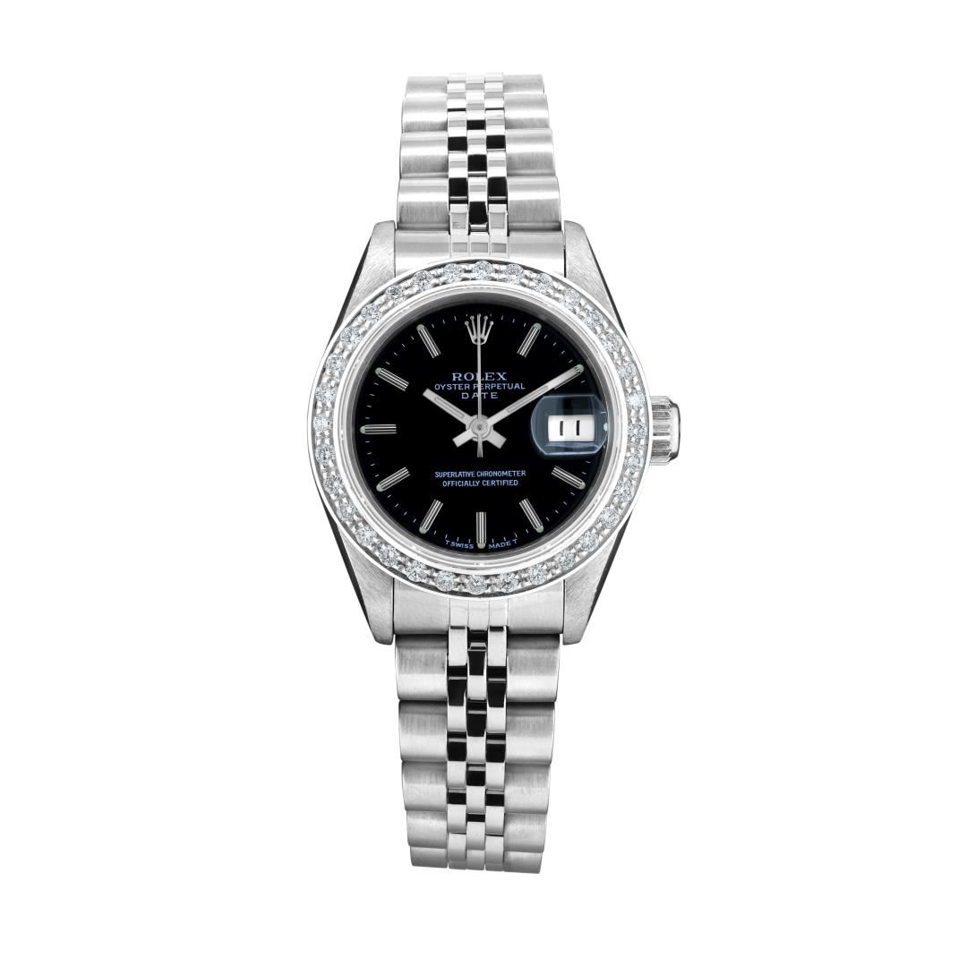One Rolex Ladies Pre Owned Stainless Steel Date Wristwatch Polished Bright with Satin Finish, Serviced & Electronically Tested, Stainless Steel Case: 26mm, Stainless Steel Crown, Custom Bezel: New 18K White Gold Beadset Diamond Bezel, Diamond Count: 32 Diamonds. Custom Crystal: New Sapphire With Magnified Date Window. Custom Hands: New Luminescent Hands. Rolex Movement: 2135 Automatic Winding Movement. Rolex Dial: Factory Black With Index Hour Markers And Lumi Dots. Date Window: 3 O'Clock Position Date Display, Model: Quickset Date. Condition: G-6 Extra Fine. Rolex Bracelet: Stainless Steel Jubilee Band. Bright Polish & Satin Finish. 6.0 Inch Length, Adjustable. Standard Clasp, With Rolex Logo. This Watch Has Been Serviced And Time Tested. It Is In Excellent Condition, Free Of All Scratches And Dents. This Watch Comes With A Rolex Box.