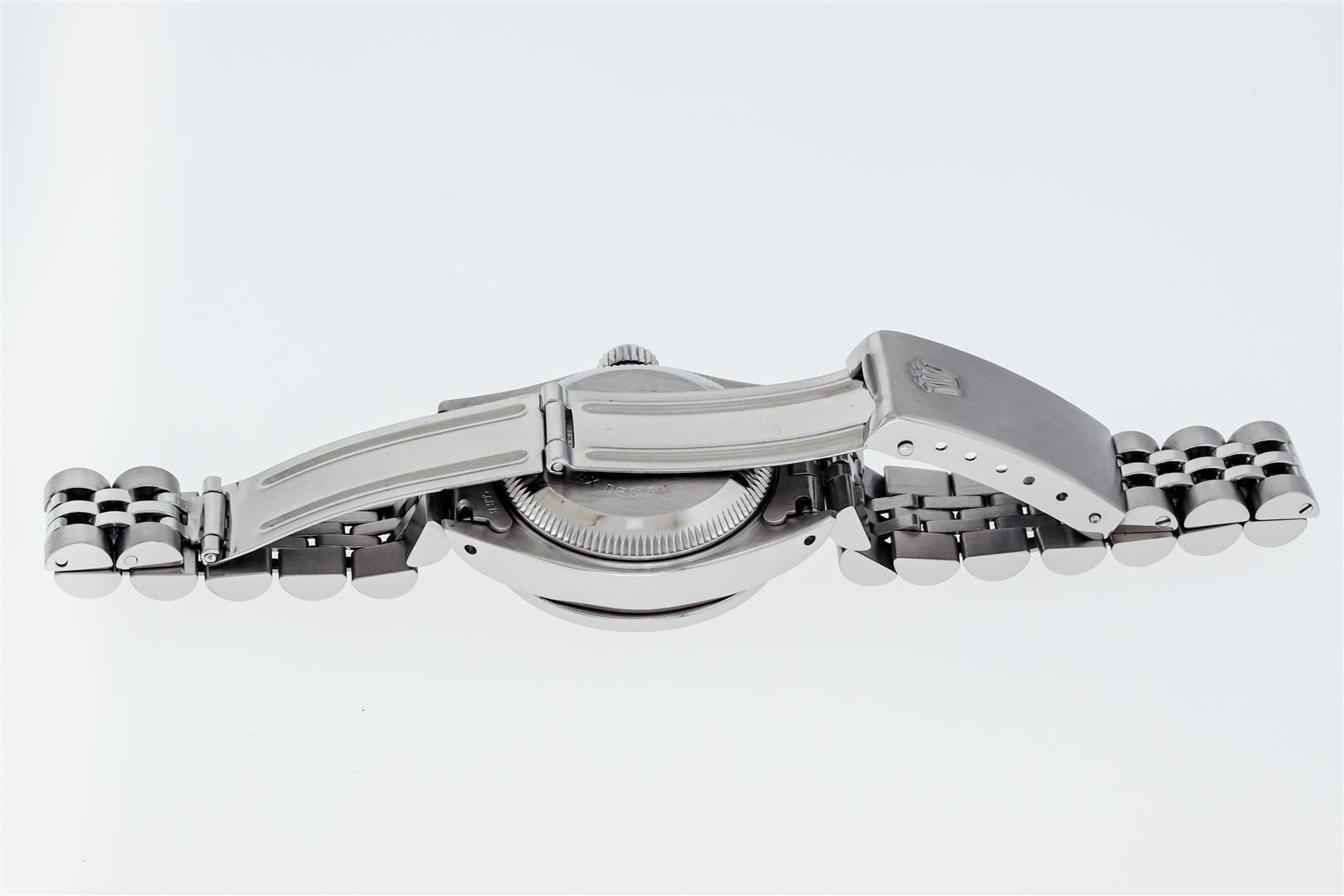 One Ladies Pre Owned Quickset Stainless Steel Rolex Datejust Polished Bright with Satin Finish Serviced & Electronically Tested, Rolex Stainless Steel Case: 26mm, Rolex Stainless Steel Crown, Custom Bezel: New Stainless Steel Diamond Pave Bezel, Diamond Count: 40 Diamonds, Color: G to H, Clarity: SI-VS, Custom Crystal: New Sapphire With Magnified Date Window. Custom Hands: New Luminescent Hands. Rolex Movement: Automatic Winding Movement. Rolex Dial: Black Index Dial With Dash Track And Lumi Dots. Date Window: 3 O'Clock Position Date Display, Model: Quickset Datejust. Condition: G-6 Extra Fine. Rolex Bracelet: Stainless Steel Jubilee Band With Rolex Crown On Buckle. Bright Polish & Satin Finish. Band Length: 6.0 Inch Length, Adjustable. Standard Clasp, With Rolex Logo. This Watch Has Been Serviced Time Tested And Is In Excellent Condition It Is Free Of All Scratches And Dents.