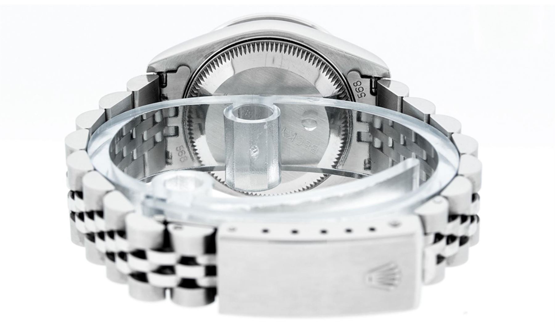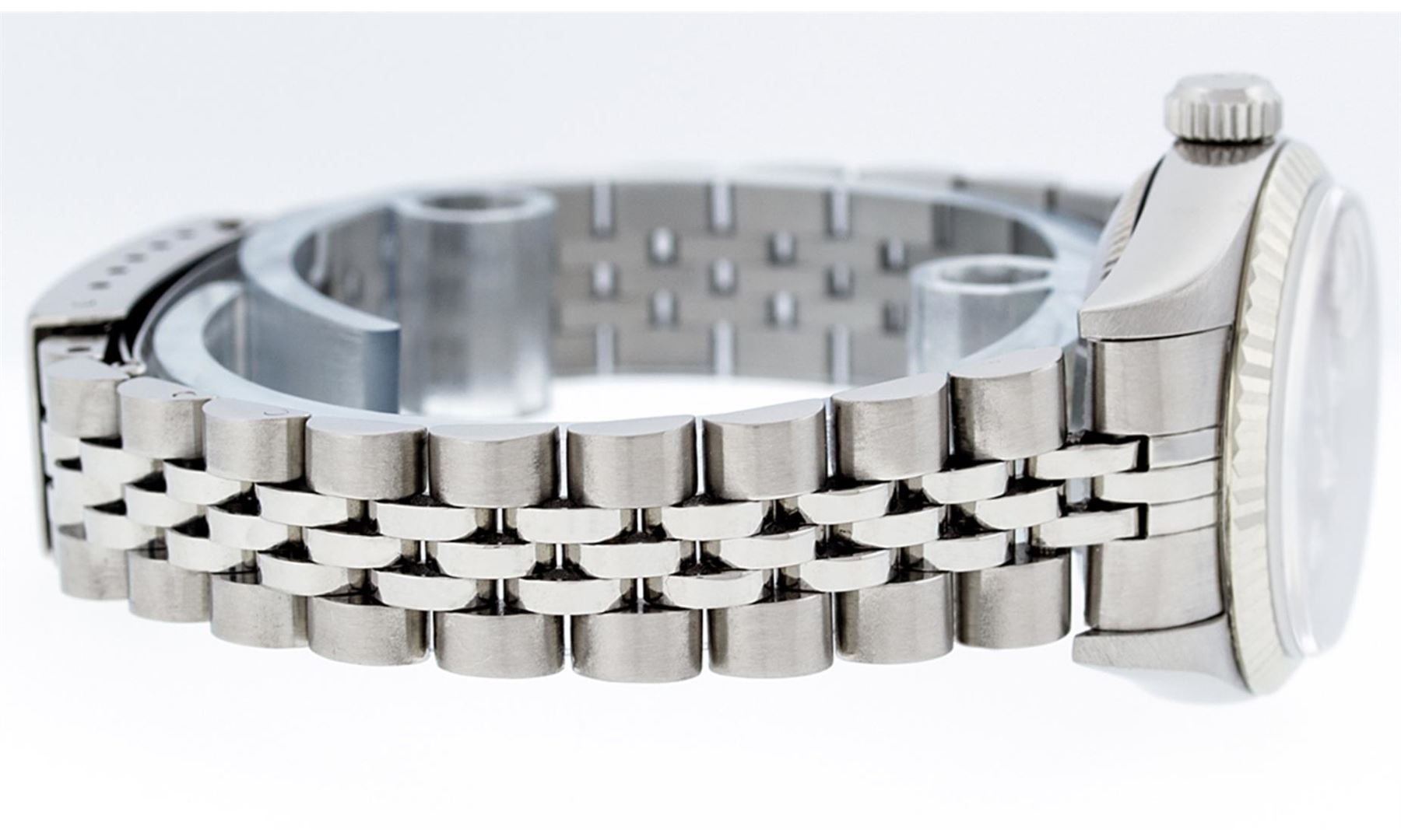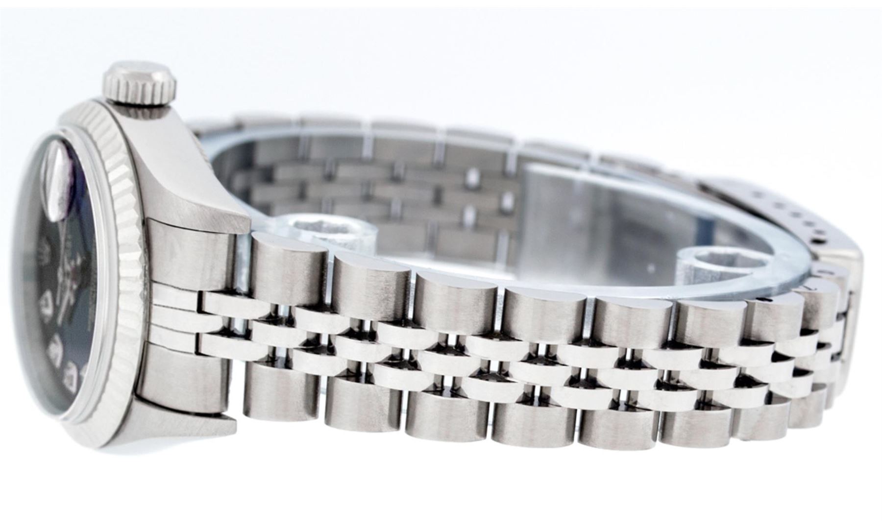 One Rolex Ladies Pre Owned Quickset Stainless Steel Datejust Polished Bright with Satin Finish, Serviced And Electronically Tested, Rolex Stainless Steel Case: 26mm, Rolex Stainless Steel Crown, Rolex Bezel: 18K White Gold Fluted Bezel. Custom Crystal: New Sapphire With Date Window. Custom Hands: New Luminescent Hands. Rolex Movement: Automatic Winding Movement 2235. Custom Dial: Custom Blue Dial With Added Diamonds, Diamond Count: 10 Diamonds On Dial. Date Window: 3 O'Clock Position Date Display, Model: Quickset Datejust. Condition: G-6 Extra Fine. Rolex Bracelet: Stainless Steel Jubilee Band. Bright Polish And Satin Finish. 6.0 Inch Length, Adjustable. Standard Clasp, With Rolex Logo. This Watch Has Been Serviced Time Tested And Is In Excellent Condition It Is Free Of All Scratches And Dents.