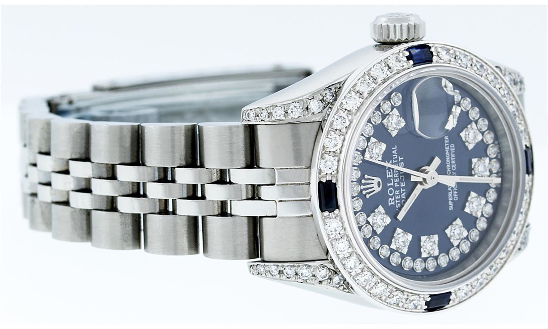One Quickset Ladies Stainless Steel Rolex Datejust Polished Bright with Satin Finish, Serviced & Electronically Tested, Stainless Steel Case: 26mm, Stainless Steel Crown, Custom Diamond Lugs: 24 Diamonds On Lugs, Clarity: SI-VS, Color: G to H. Custom Bezel: New 18K White Gold Diamond + Sapphire Beadset Diamond Bezel, Stone Count: 28 Diamonds + 4 Sapphires, Total Weight .70 Carat, Clarity: SI-VS, Color: G to H. Custom Crystal: New Scratch Resistant Synthetic Sapphire Cyclops Lens. Custom Hands: New Luminescent Hands. Movement: Automatic Winding Movement Caliber 2235. Custom Dial: Refinished Single Cut Blue String Diamond Dial, 43 Diamonds in Dial G To H In Color, Clarity: VS. Date Window: 3 O'Clock Position Date Display, Model: Quickset Datejust. Condition: G-6 Extra Fine. Bracelet: Stainless Steel Jubilee Band. Bright Polish & Satin Finish. 6.0 Inch Length, Adjustable. Standard Clasp, With Rolex Logo. This Watch Has Been Serviced Time Tested And Is In Excellent Condition It Is Free Of All Scratches And Dents.