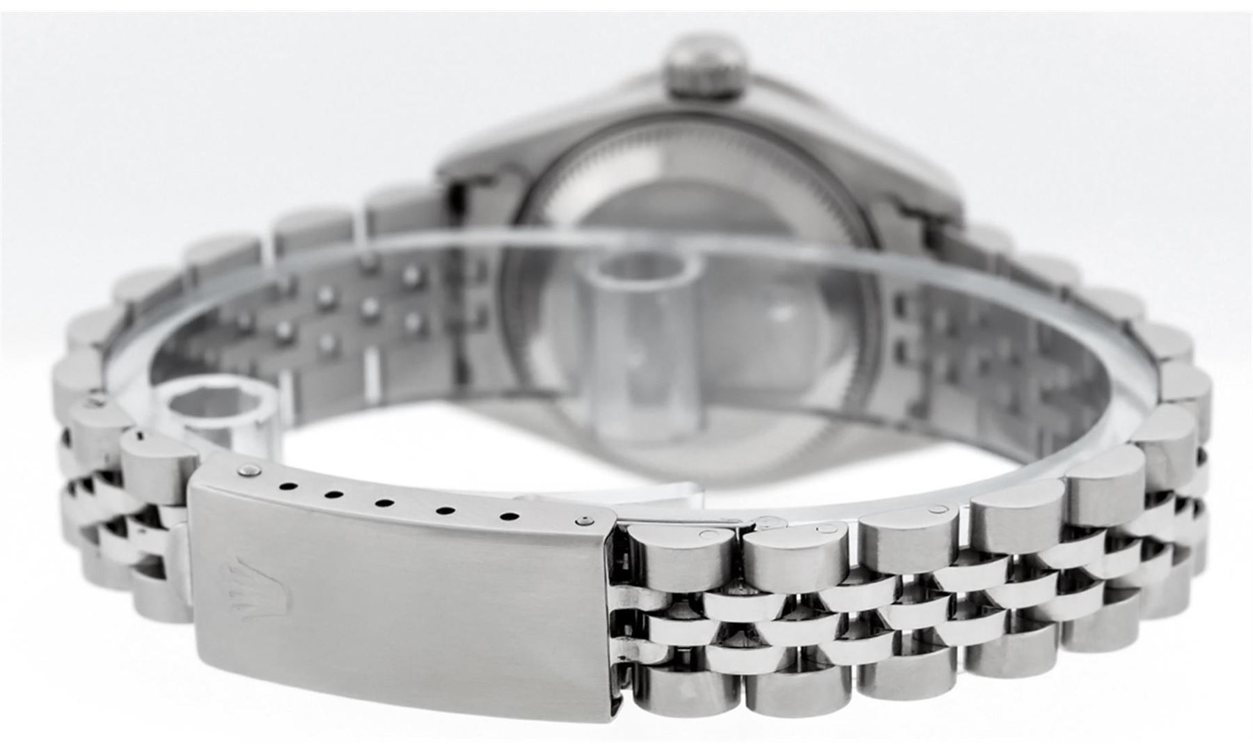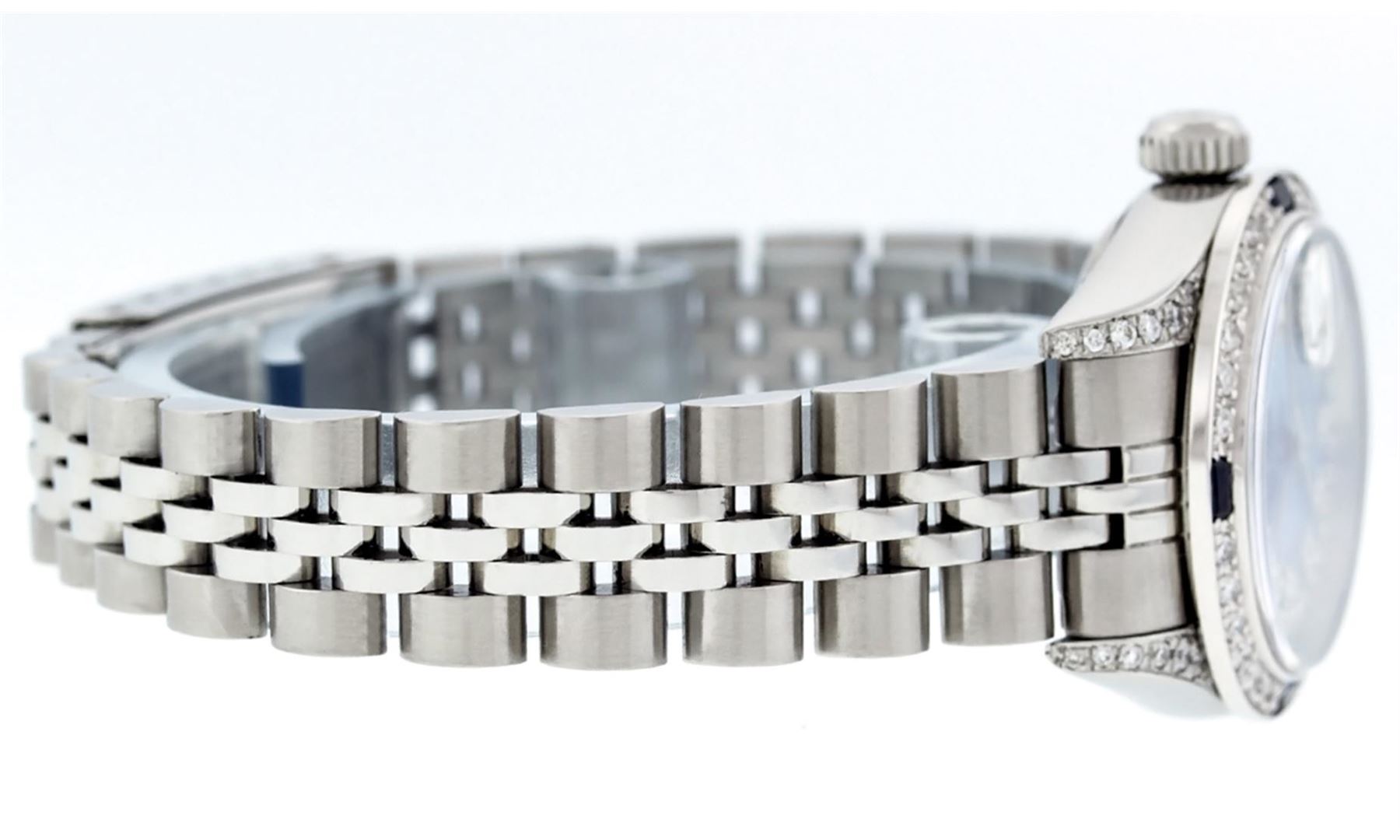 One Quickset Ladies Stainless Steel Rolex Datejust Polished Bright with Satin Finish, Serviced & Electronically Tested, Stainless Steel Case: 26mm, Stainless Steel Crown, Custom Diamond Lugs: 24 Diamonds On Lugs, Clarity: SI-VS, Color: G to H. Custom Bezel: New 18K White Gold Diamond + Sapphire Beadset Diamond Bezel, Stone Count: 28 Diamonds + 4 Sapphires, Total Weight .70 Carat, Clarity: SI-VS, Color: G to H. Custom Crystal: New Scratch Resistant Synthetic Sapphire Cyclops Lens. Custom Hands: New Luminescent Hands. Movement: Automatic Winding Movement Caliber 2235. Custom Dial: Refinished Single Cut Blue Mother Of Pearl String Diamond Dial, 43 Diamonds in Dial G To H In Color, Clarity: VS. Date Window: 3 O'Clock Position Date Display, Model: Quickset Datejust. Condition: G-6 Extra Fine. Bracelet: Stainless Steel Jubilee Band. Bright Polish & Satin Finish. 6.0 Inch Length, Adjustable. Standard Clasp, With Rolex Logo. This Watch Has Been Serviced Time Tested And Is In Excellent Condition It Is Free Of All Scratches And Dents.