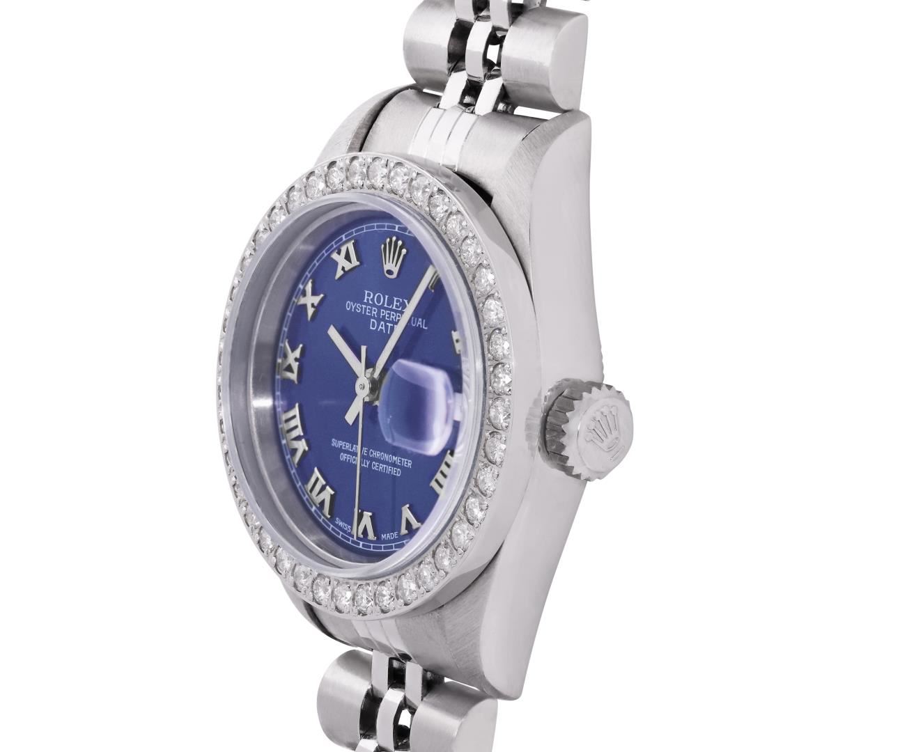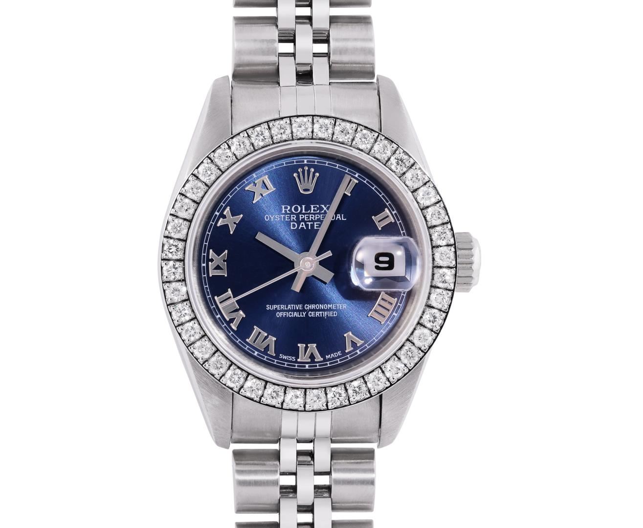 One Rolex Ladies Pre Owned Quickset Stainless Steel Date Wristwatch Polished Bright with Satin Finish, Serviced & Electronically Tested, Stainless Steel Case: 26mm, Stainless Steel Crown, Custom Bezel: New Stainless Steel Beadset Diamond Bezel, Diamond Count: 40 Diamonds On Bezel. Custom Crystal: New Sapphire With Magnified Date Window. Custom Hands: New Non Luminescent Hands. Rolex Movement: 2235 Automatic Winding Movement. Rolex Dial: Factory Blue With Roman Hour Markers, Square Track. Date Window: 3 O'Clock Position Date Display, Model: Quickset Date. Condition: G-6 Extra Fine. Rolex Bracelet: Stainless Steel Jubilee Band. Bright Polish And Satin Finish. 6.0 Inch Length, Adjustable. Standard Clasp, With Rolex Logo. This Watch Has Been Serviced And Time Tested. It Is In Excellent Condition, Free Of All Scratches And Dents.